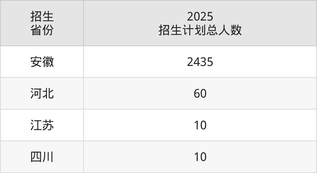 2025年安徽工业经济职业技术学院面向全国4个省市开展专科招生;招生专业共34个,招生人数共2515人。2025年在安徽省招生计划总人数是2435人,其中,安徽工业经济职业技术学院在安徽省招生人数最多的是无人机应用技术。安徽工业经济职业技术学院在各省具体招生人数情况如下表。