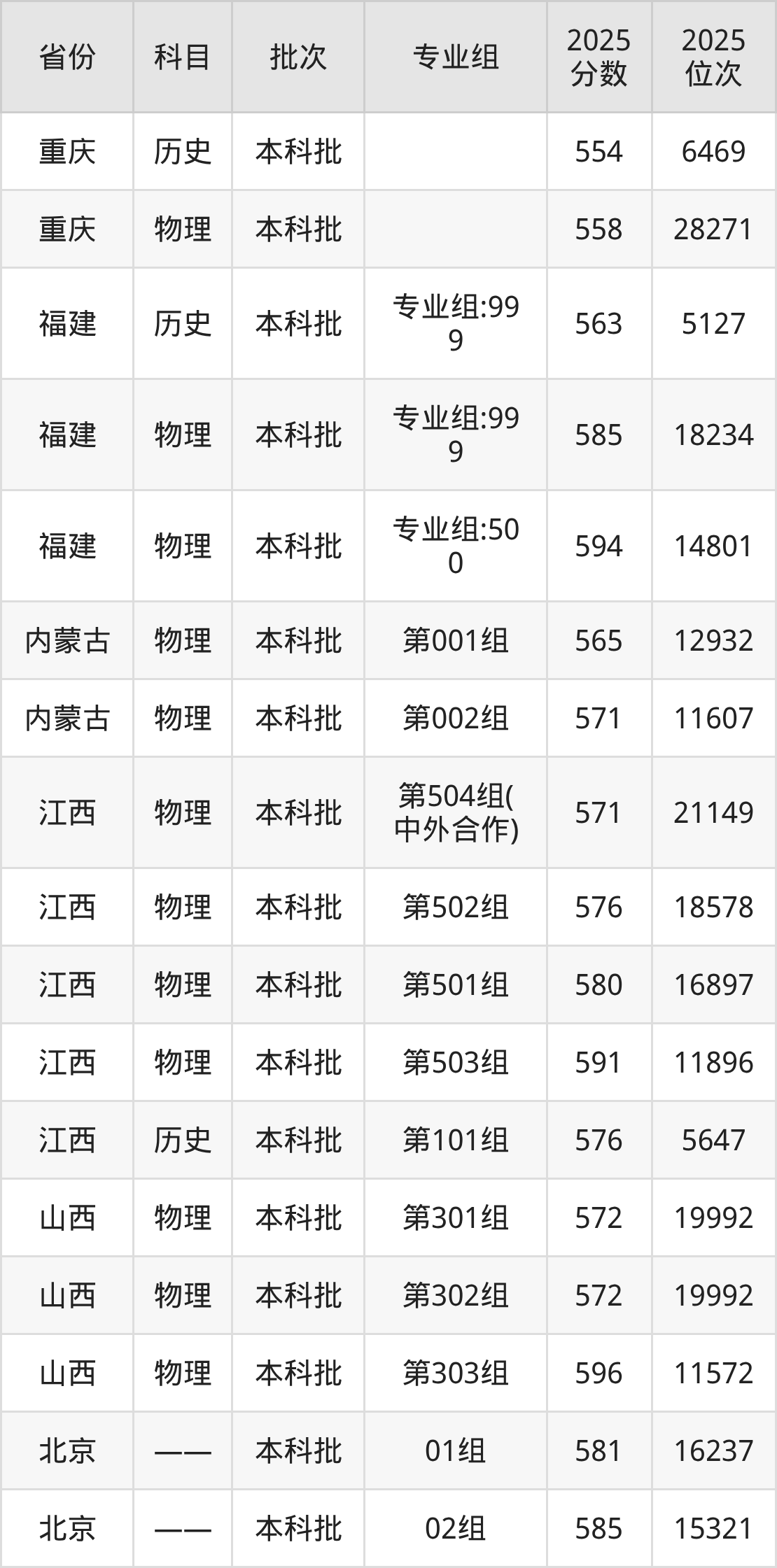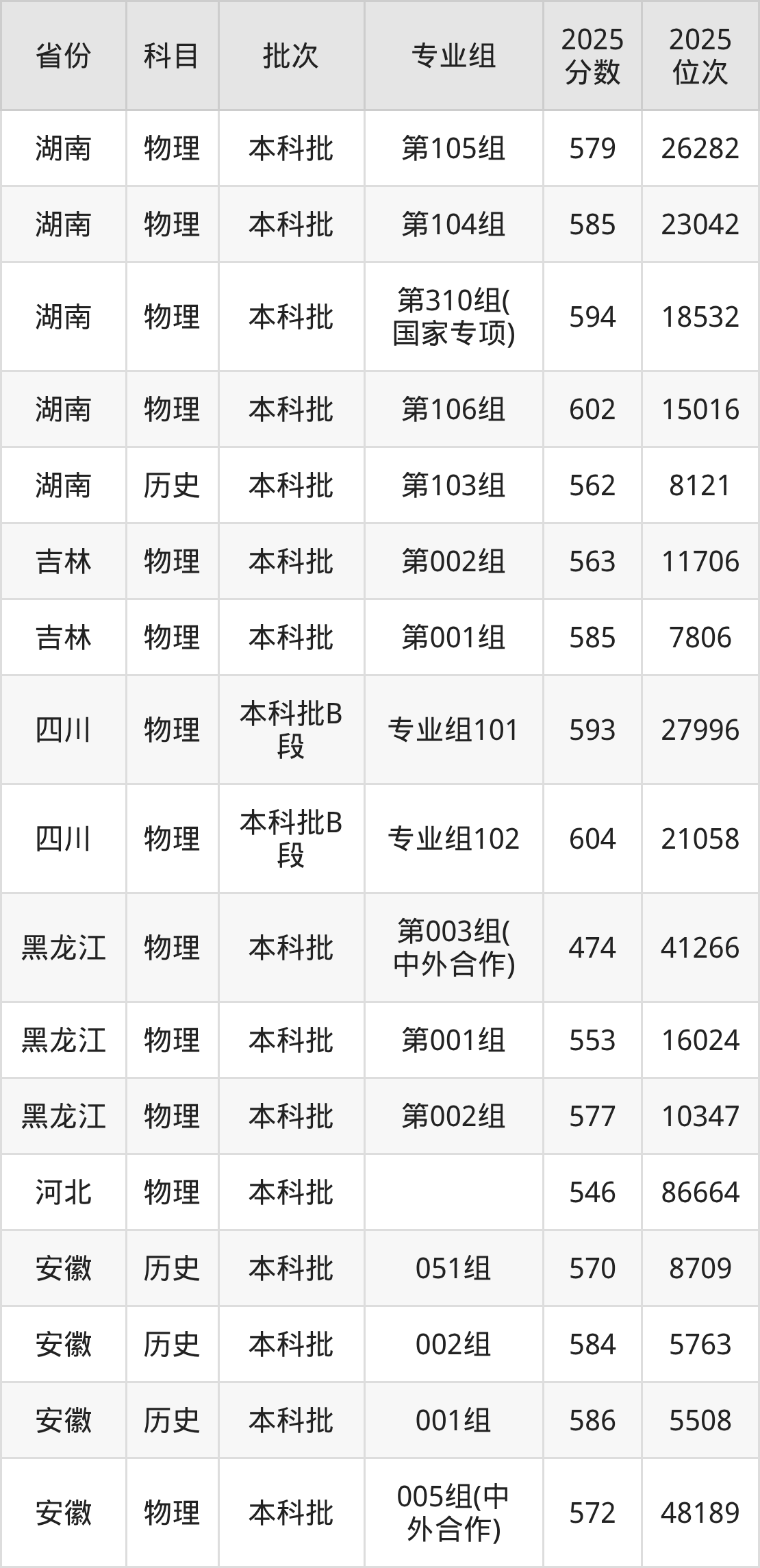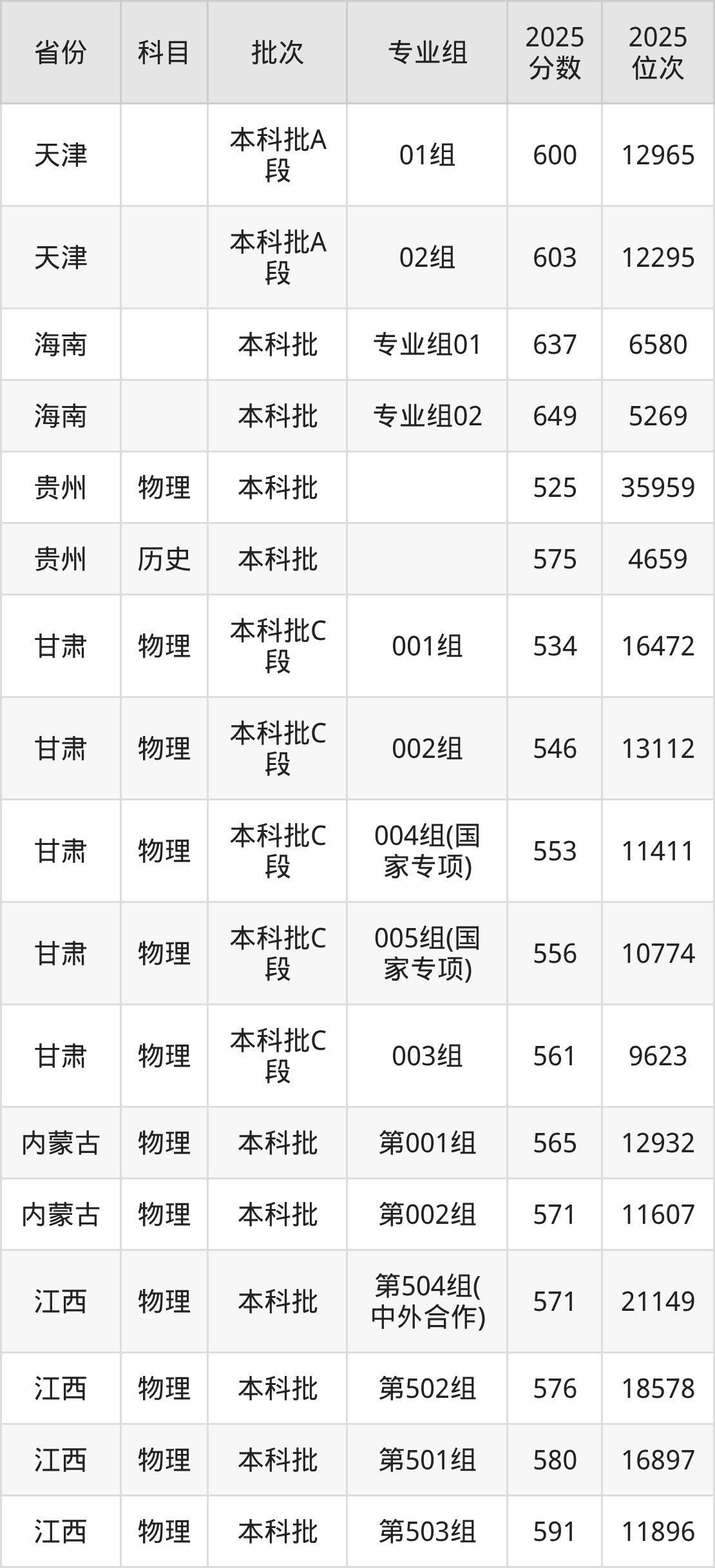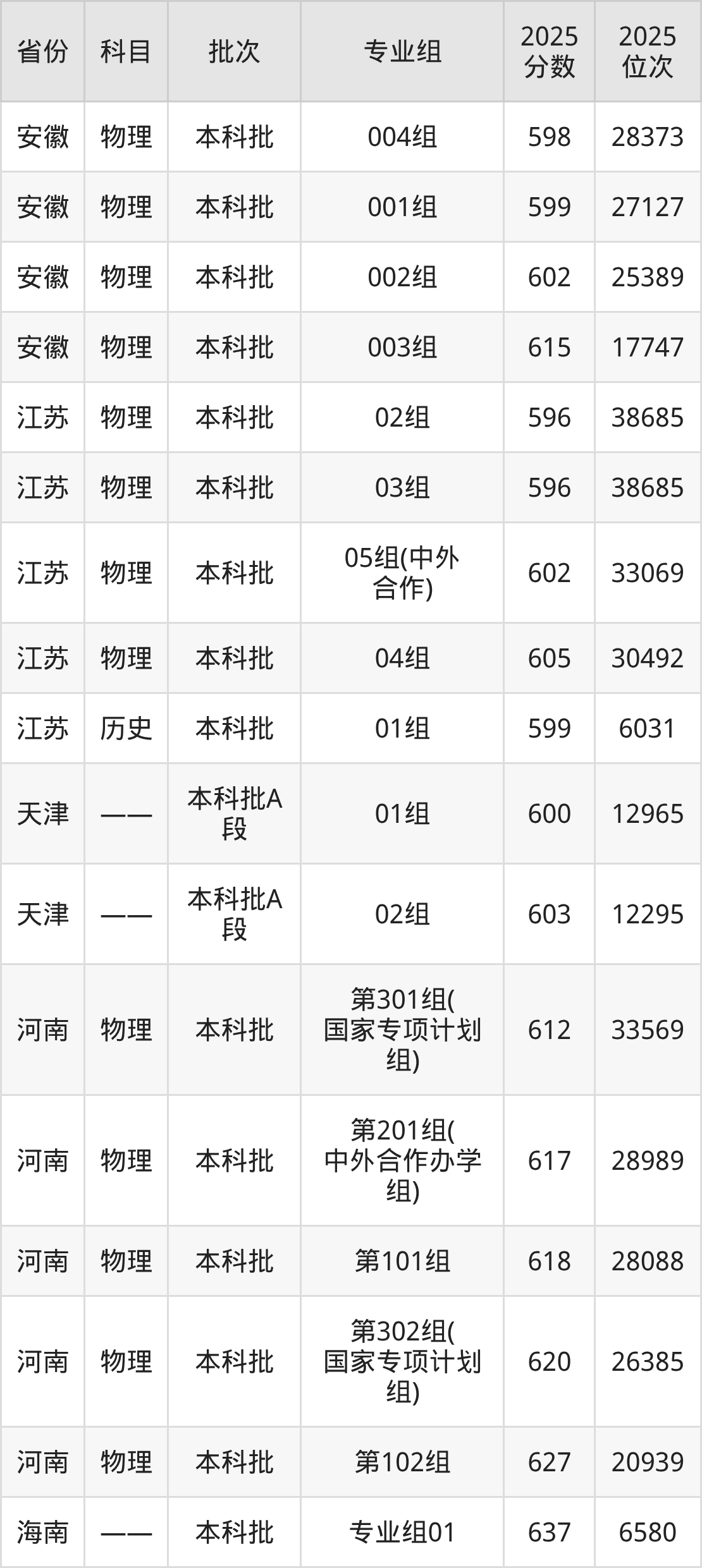 2025年在本科物理类进行招生,各专业组分数线详情如下: