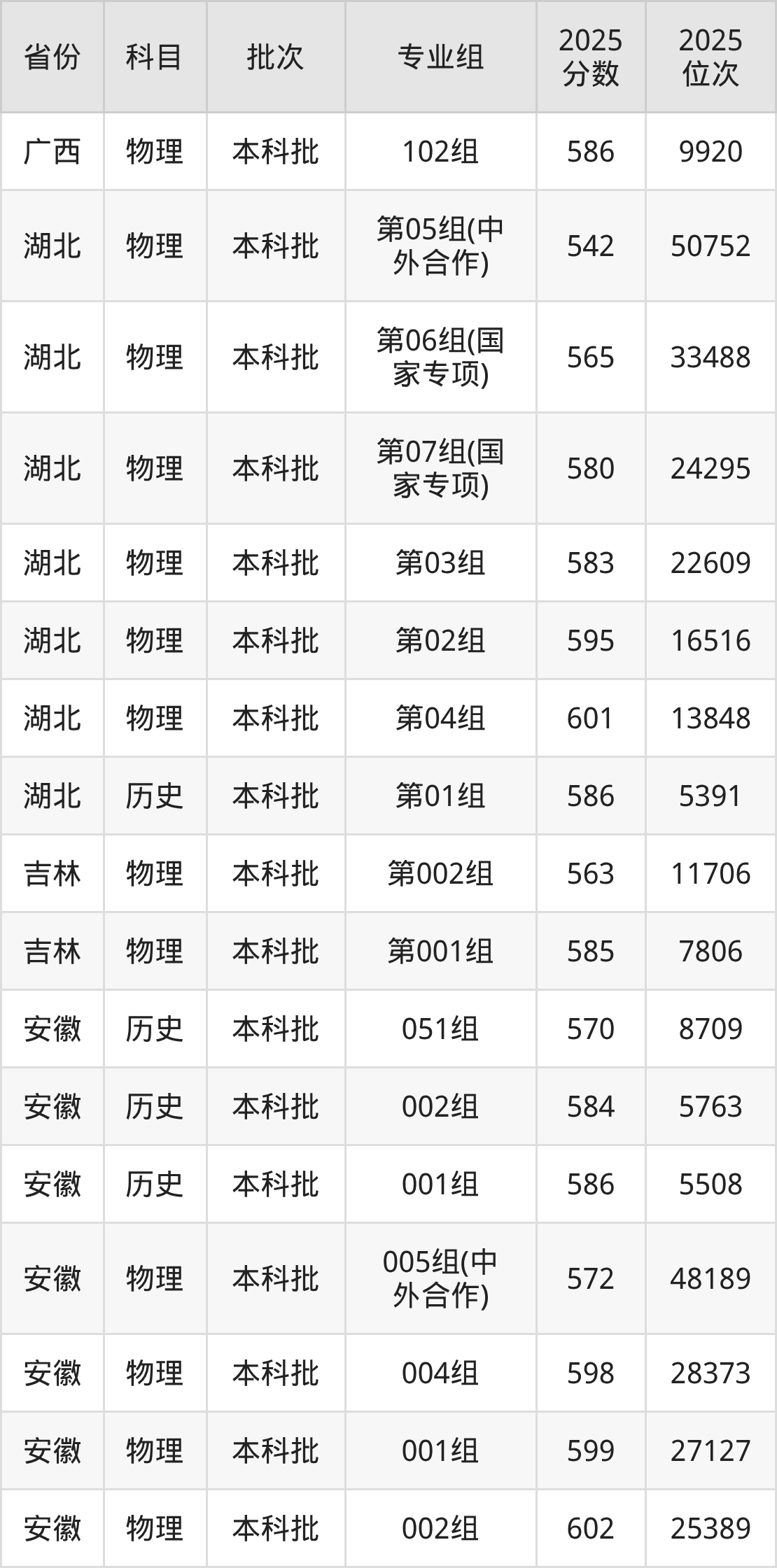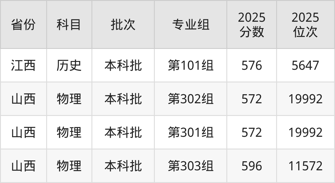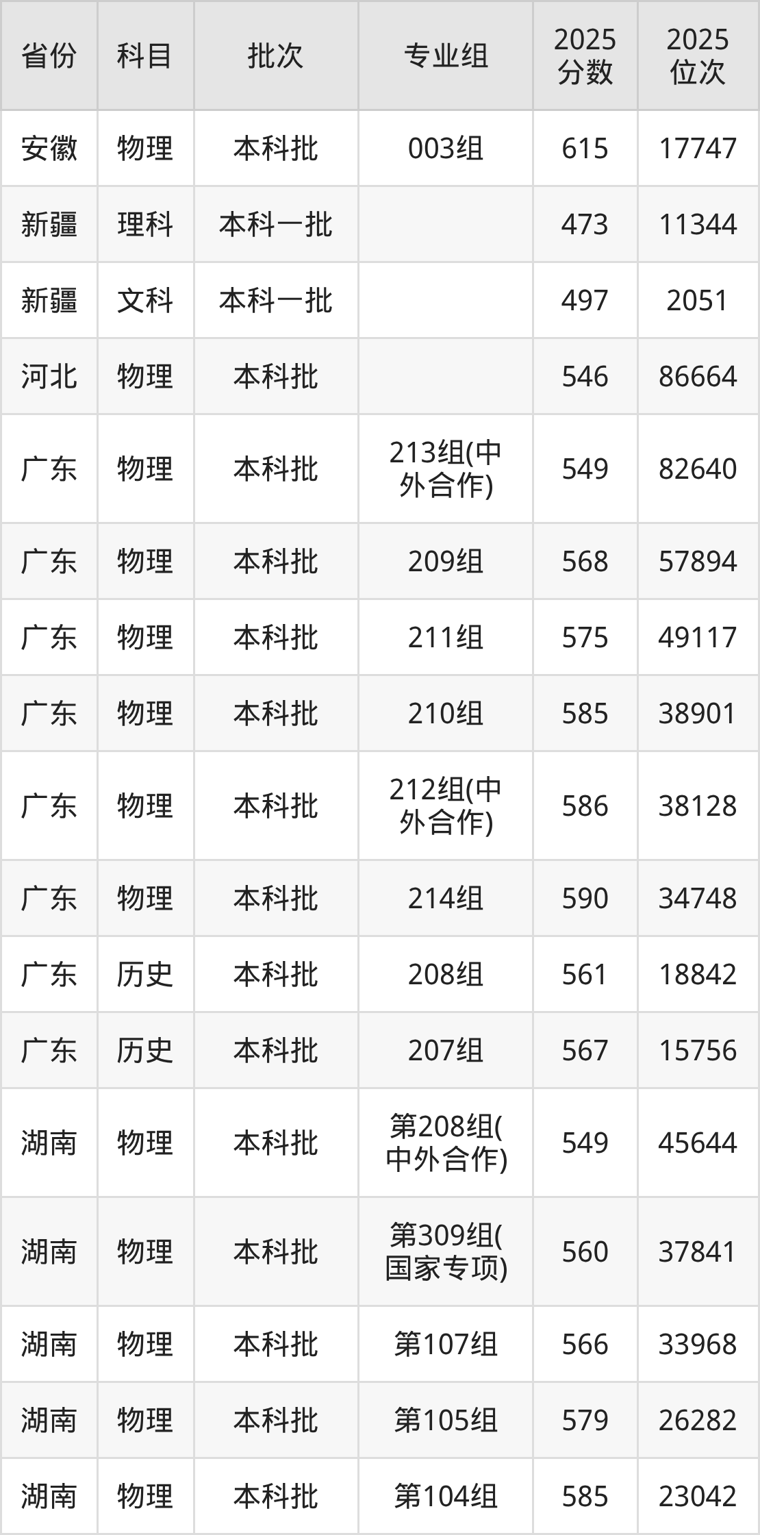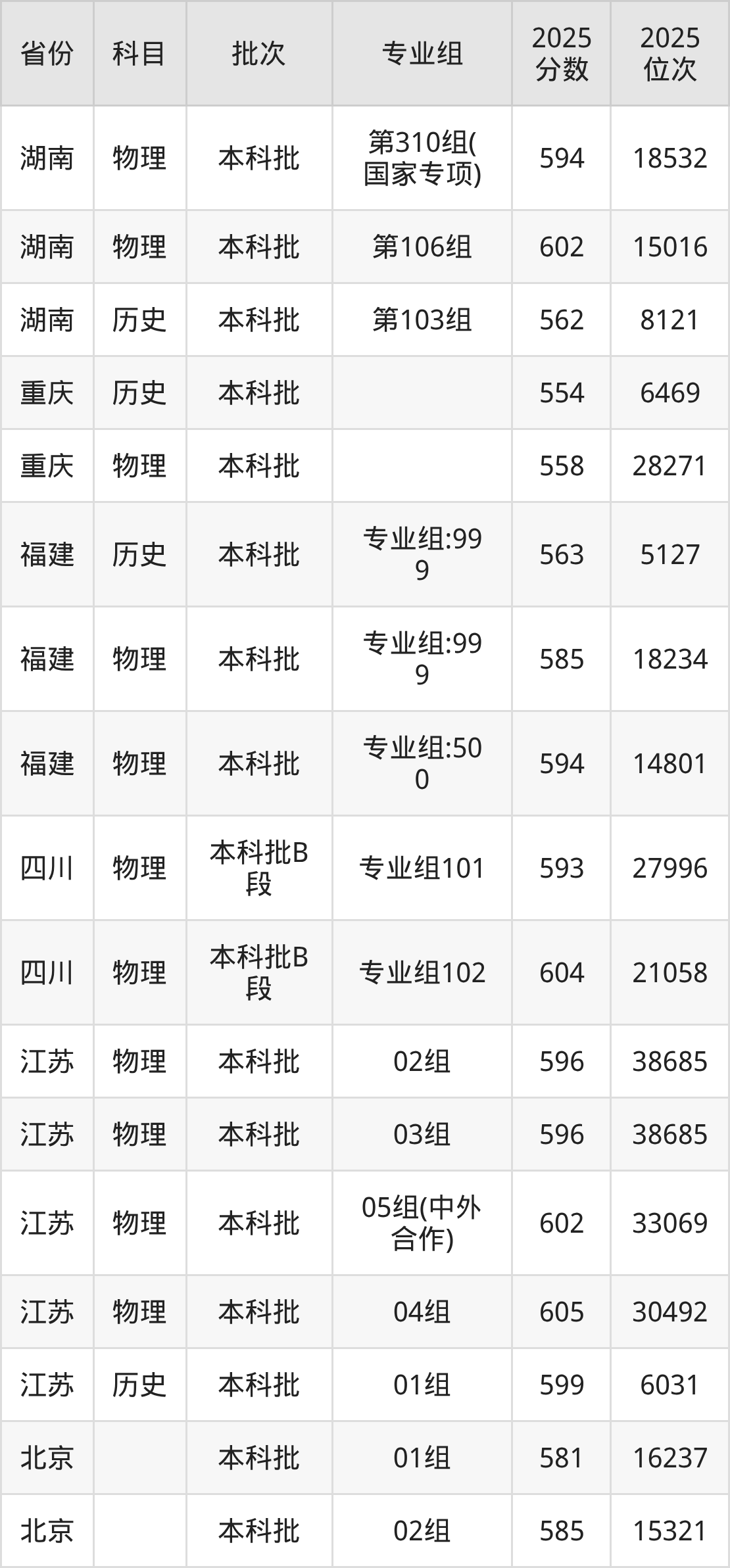 2025年在本科物理类进行招生,各专业组分数线详情如下: