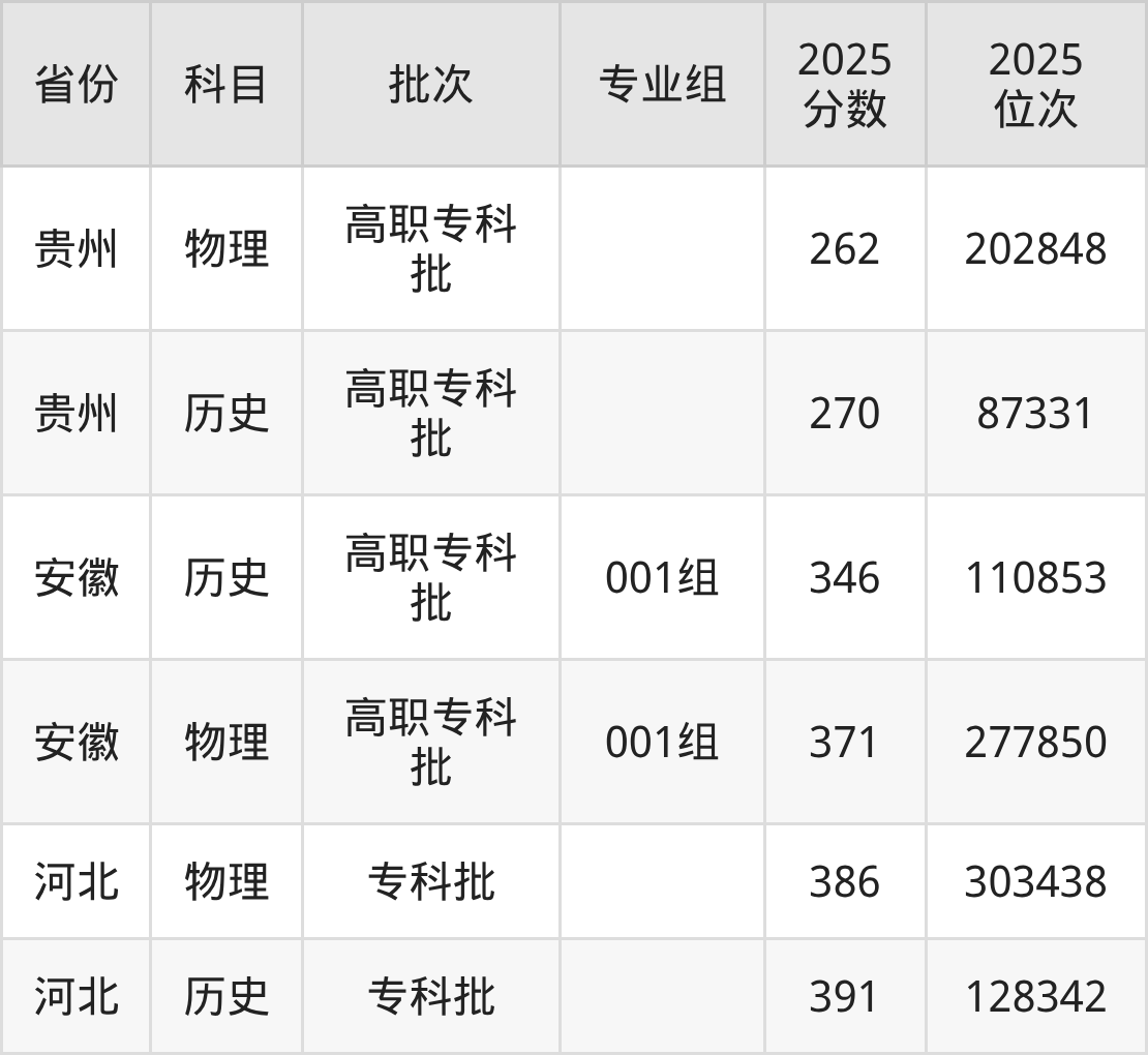 2025年六安职业技术学院全国录取分数线是262分到452分,录取最低在贵州物理类、录取最高在河北物理类。各省各专业组最低分具有差异,详情如下:
