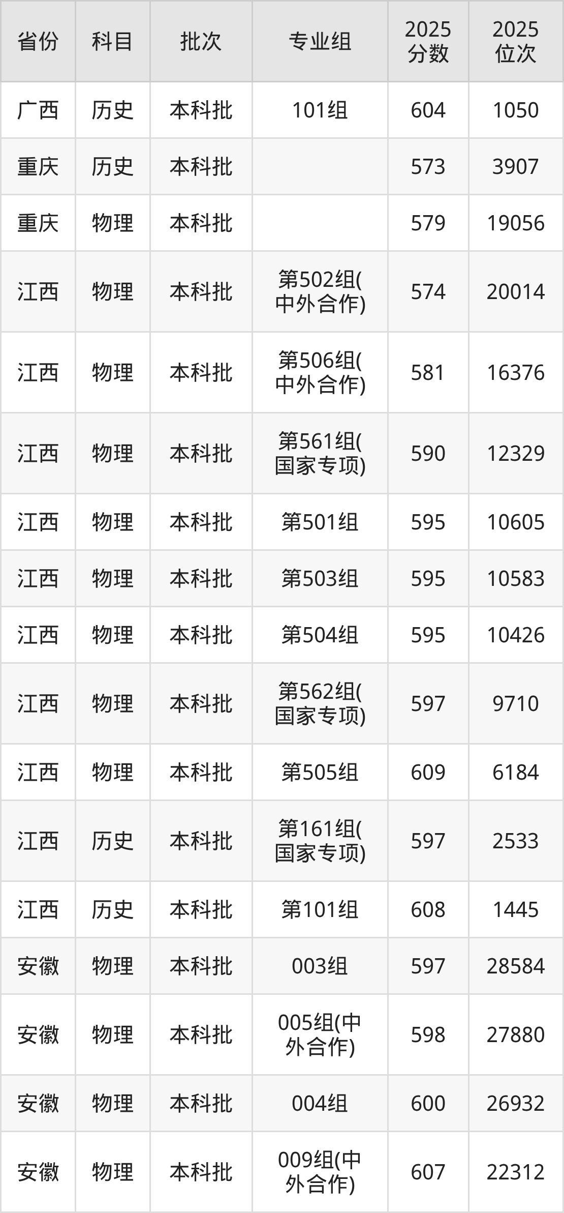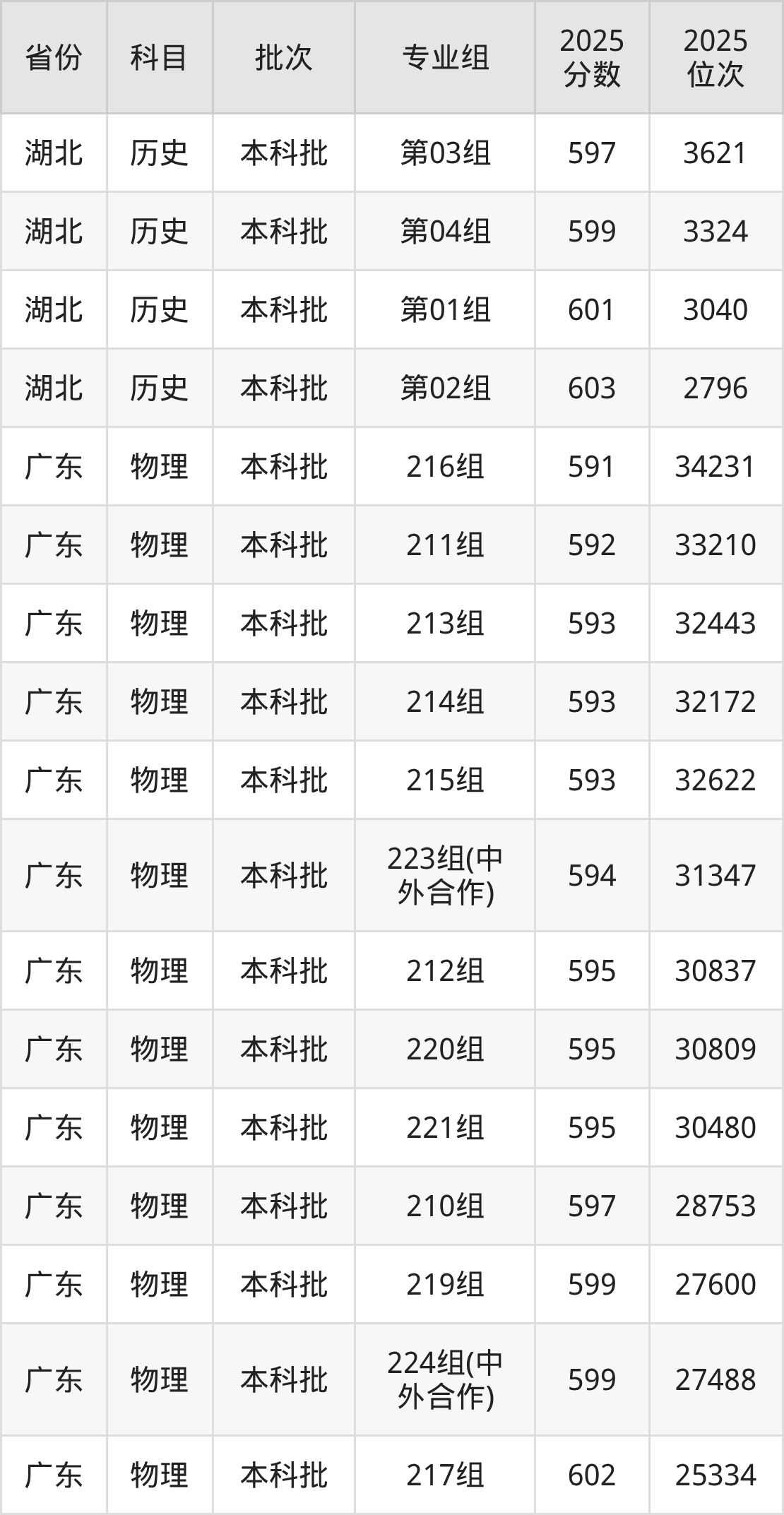 暨南大学第201组(中外合作办学组):2025年投档录取最低分为607分,录取最低位次为38498名。