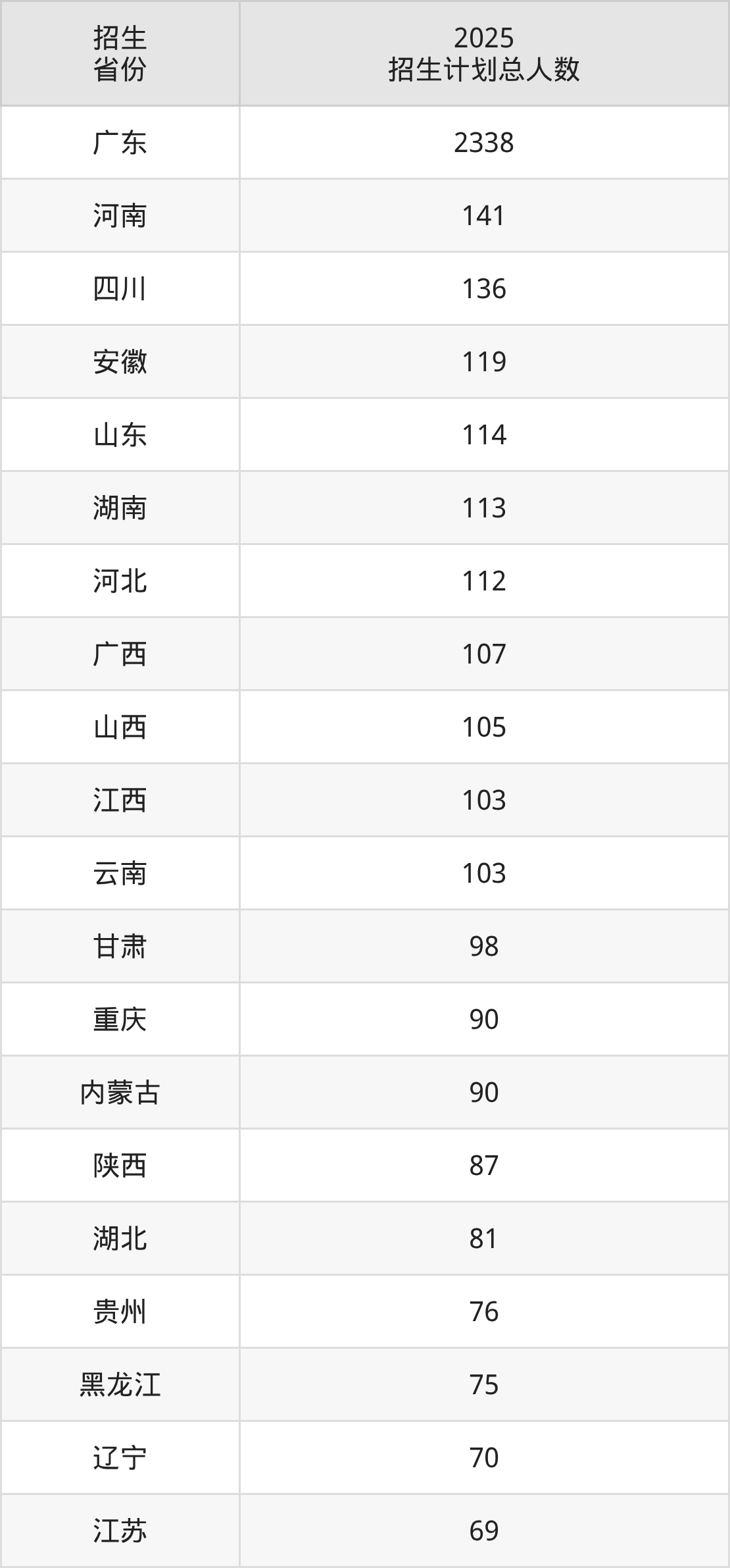 2025年暨南大学面向全国29个省市开展本科招生;招生专业共75个,招生人数共4671人。2025年在广东省招生计划总人数是2338人,其中,暨南大学在广东省招生人数最多的是电气工程及其自动化。暨南大学在各省具体招生人数情况如下表。