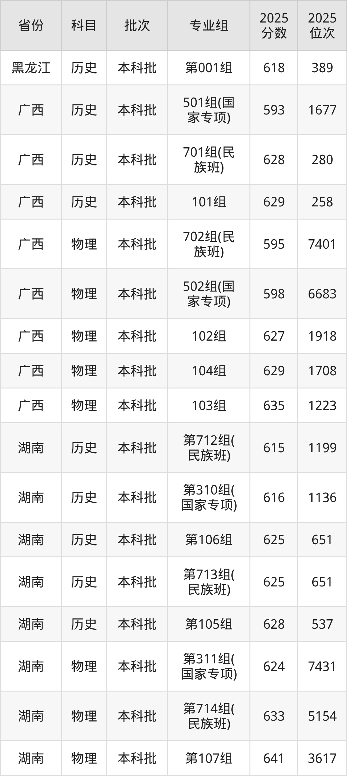 中山大学第003组(民族班):2025年投档录取最低分为615分,录取最低位次为722名。