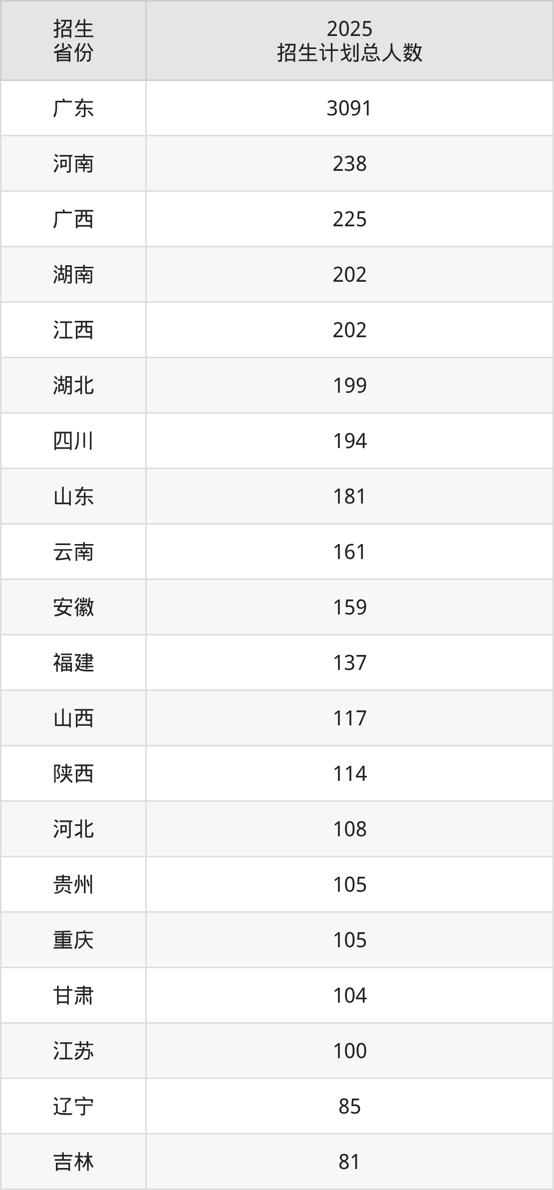 2025年中山大学面向全国29个省市开展本科招生;招生专业共63个,招生人数共6306人。2025年在广东省招生计划总人数是3091人,其中,中山大学在广东省招生人数最多的是临床医学。中山大学在各省具体招生人数情况如下表。