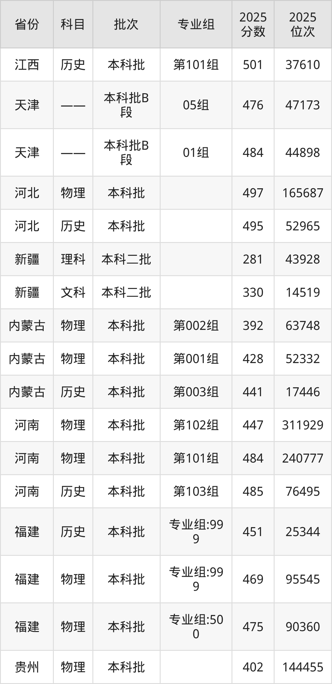 2025年武汉晴川学院全国录取分数线是281分到535分,录取最低在新疆理科、录取最高在海南(专业组01)。各省各专业组最低分具有差异,详情如下: