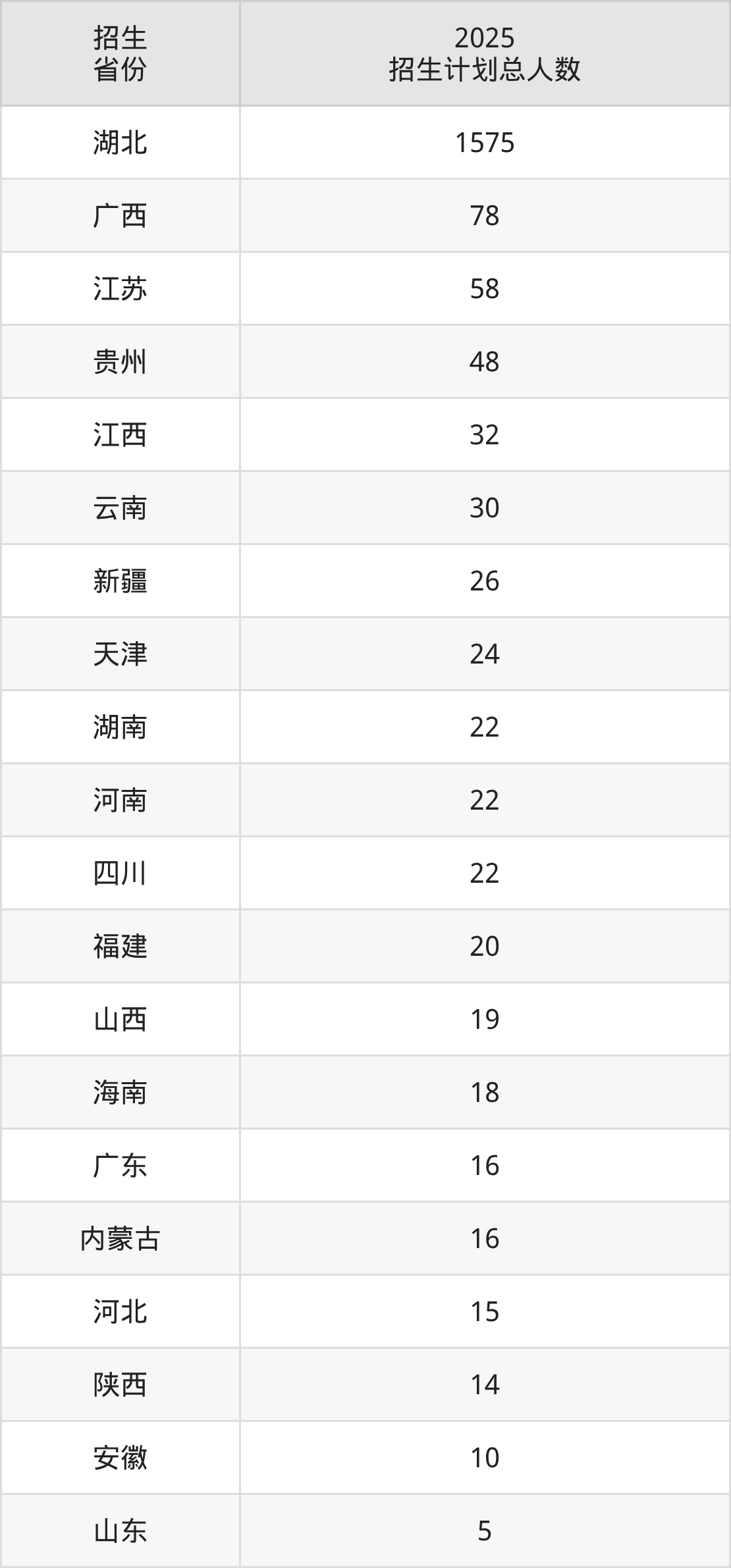 2025年武汉晴川学院面向全国20个省市开展本科招生;招生专业共25个,招生人数共2070人。2025年在湖北省招生计划总人数是1575人,其中,武汉晴川学院在湖北省招生人数最多的是计算机科学与技术。武汉晴川学院在各省具体招生人数情况如下表。