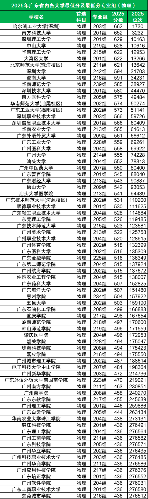 2025年高考广东省内本科大学物理类录取分数线范围在436分~662分之间,其中录取分数线最高的有哈尔滨工业大学(深圳)(203组),它在2025年的最低投档线为662分。