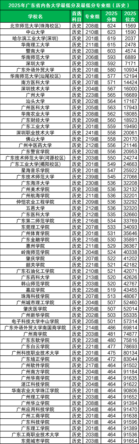 2025年高考广东省内本科大学历史类录取分数线范围在464分~624分之间,其中录取分数线最高的是北京师范大学(珠海校区)(208组),2025年最低投档线是624分,对应投档位次为1569名。