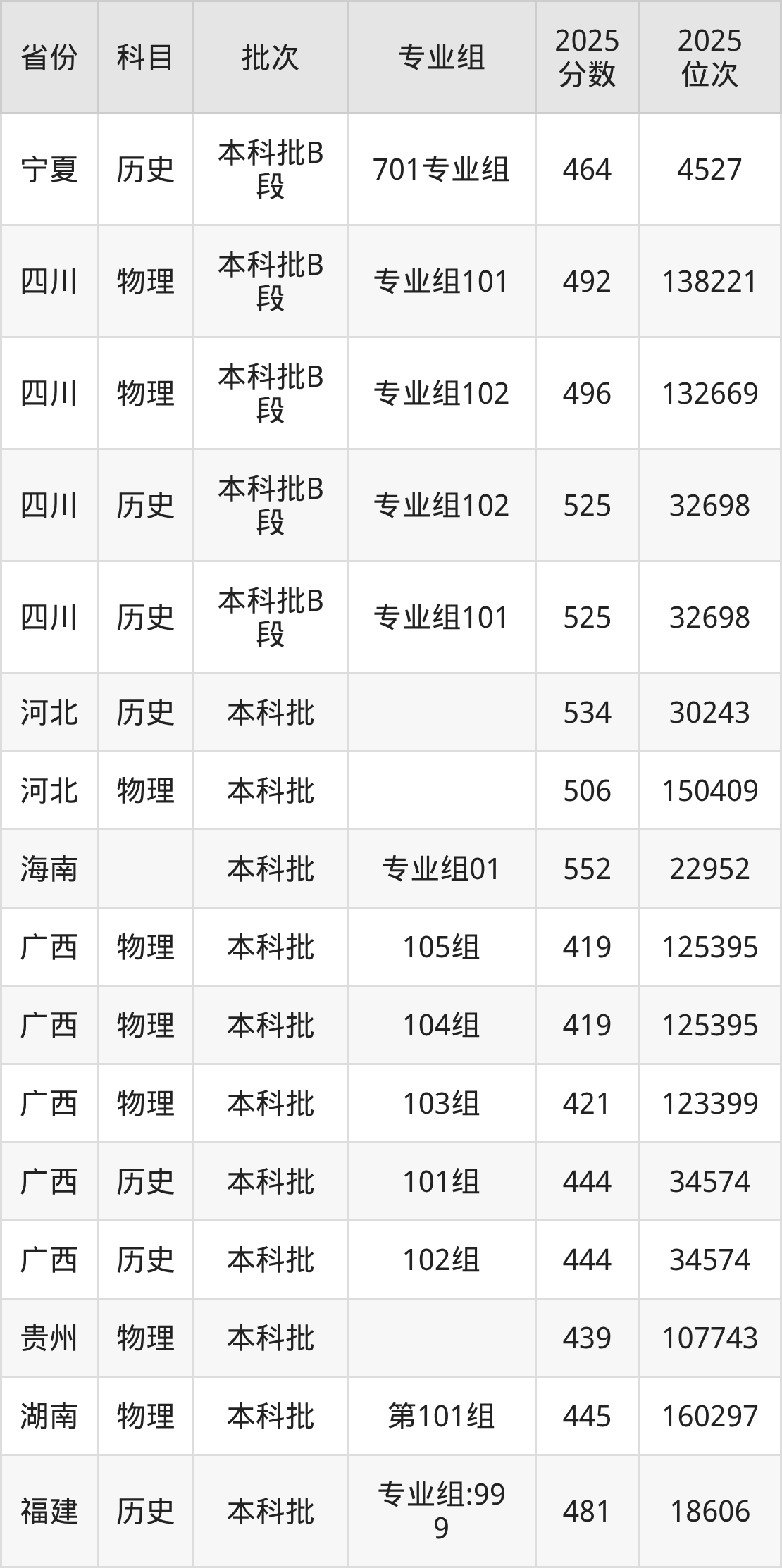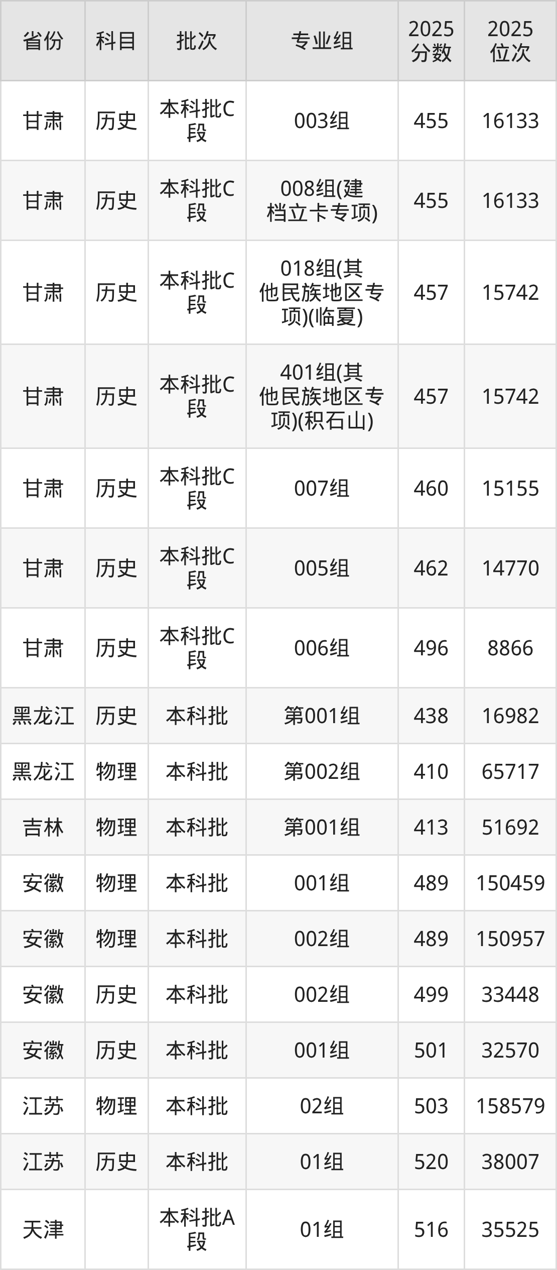 2025年在本科历史类进行招生,各专业组分数线详情如下: