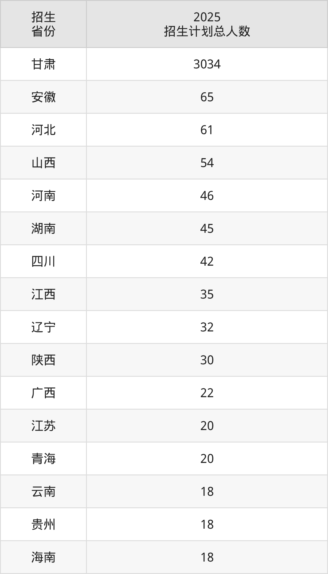 2025年兰州城市学院面向全国25个省市开展本科招生;招生专业共37个,招生人数共3658人。2025年在甘肃省招生计划总人数是3034人,其中,兰州城市学院在甘肃省招生人数最多的是汉语言文学。兰州城市学院在各省具体招生人数情况如下表。