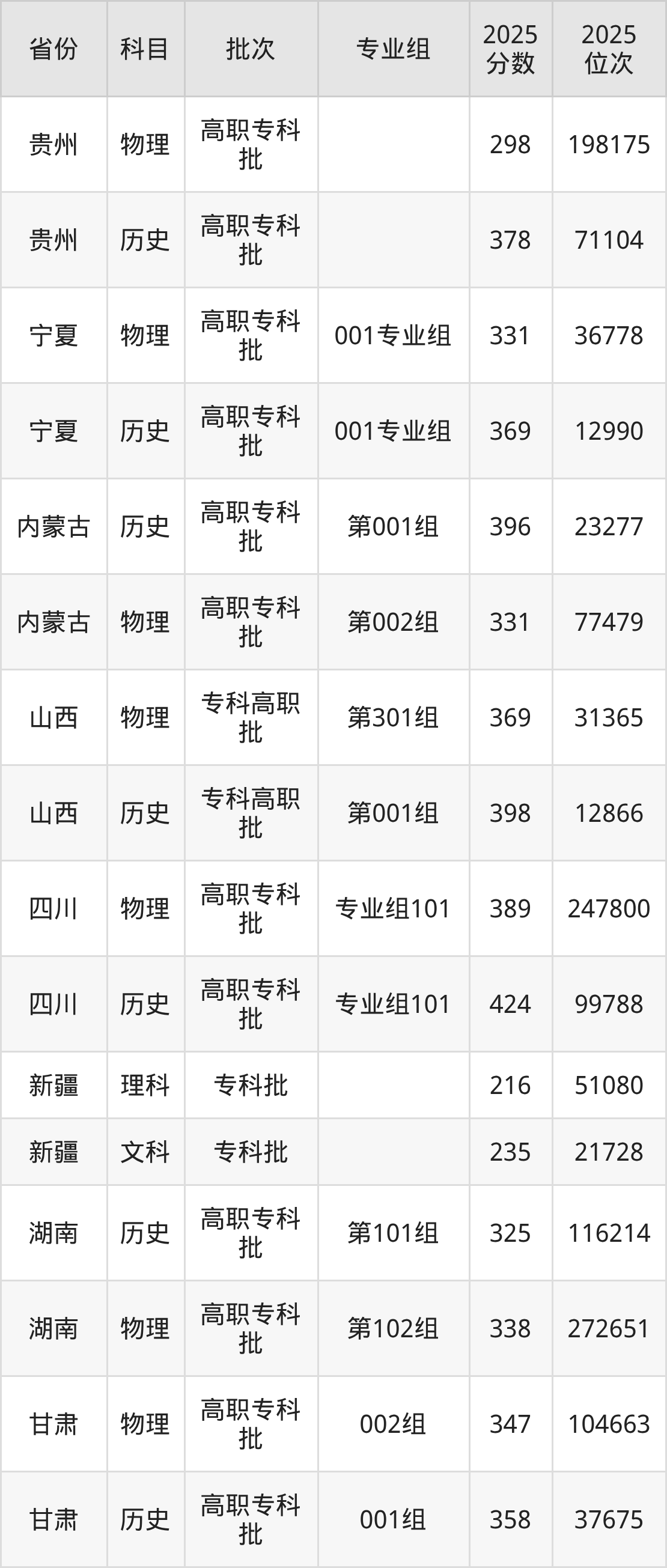 普通类专科物理类最低298分,专科历史类最低378分