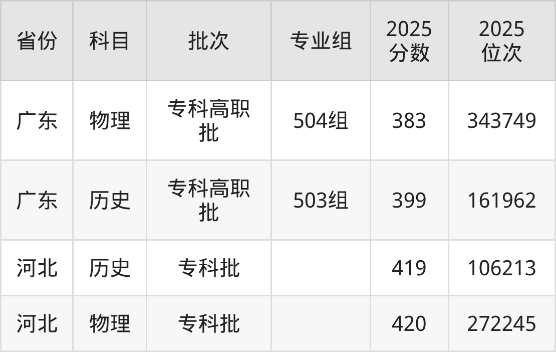 普通类专科物理类最低383分,专科历史类最低399分