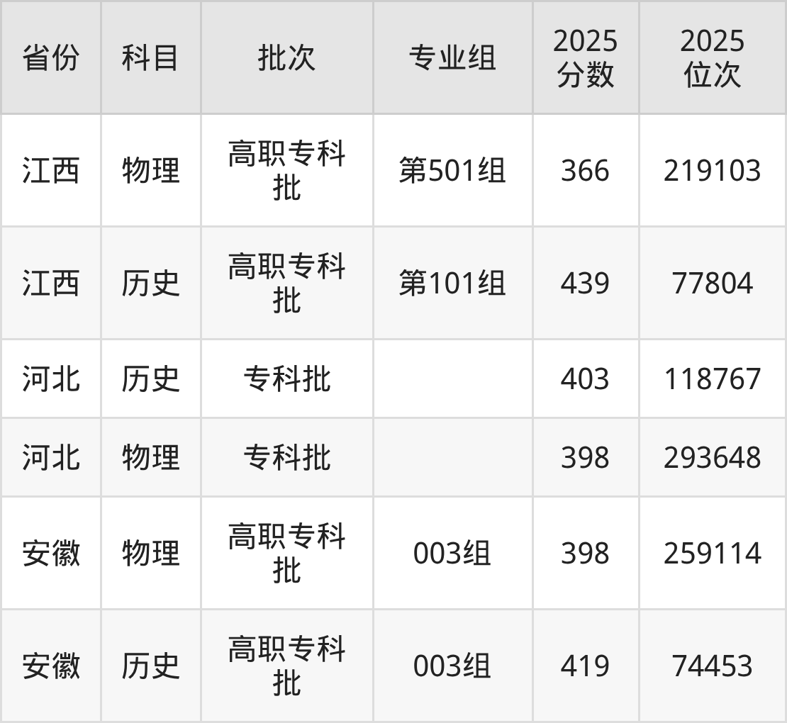 2025年阜阳职业技术学院全国录取分数线是366分到453分,录取最低在江西物理类(第501组)、录取最高在河北历史类。各省各专业组最低分具有差异,详情如下: