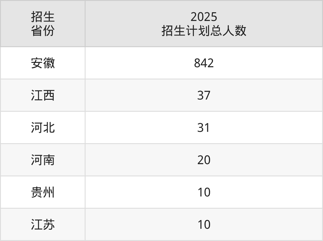 2025年阜阳职业技术学院面向全国6个省市开展专科招生;招生专业共29个,招生人数共950人。2025年在安徽省招生计划总人数是842人,其中,阜阳职业技术学院在安徽省招生人数最多的是计算机网络技术。阜阳职业技术学院在各省具体招生人数情况如下表。