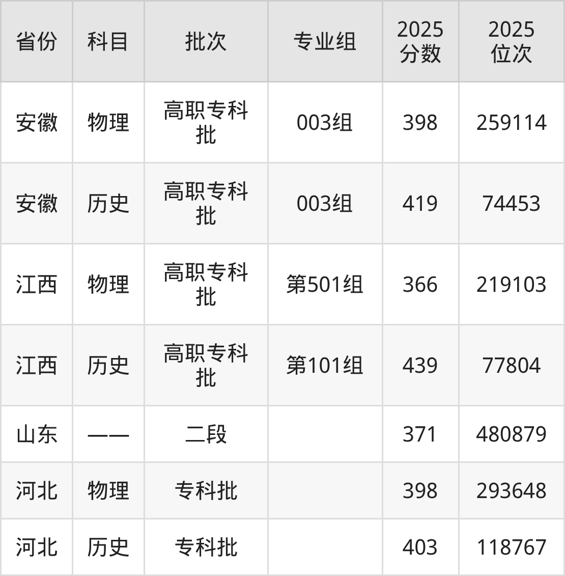 2025年阜阳职业技术学院全国录取分数线是366分到439分,录取最低在江西物理类(第501组)、录取最高在江西历史类(第101组)。各省各专业组最低分具有差异,详情如下: