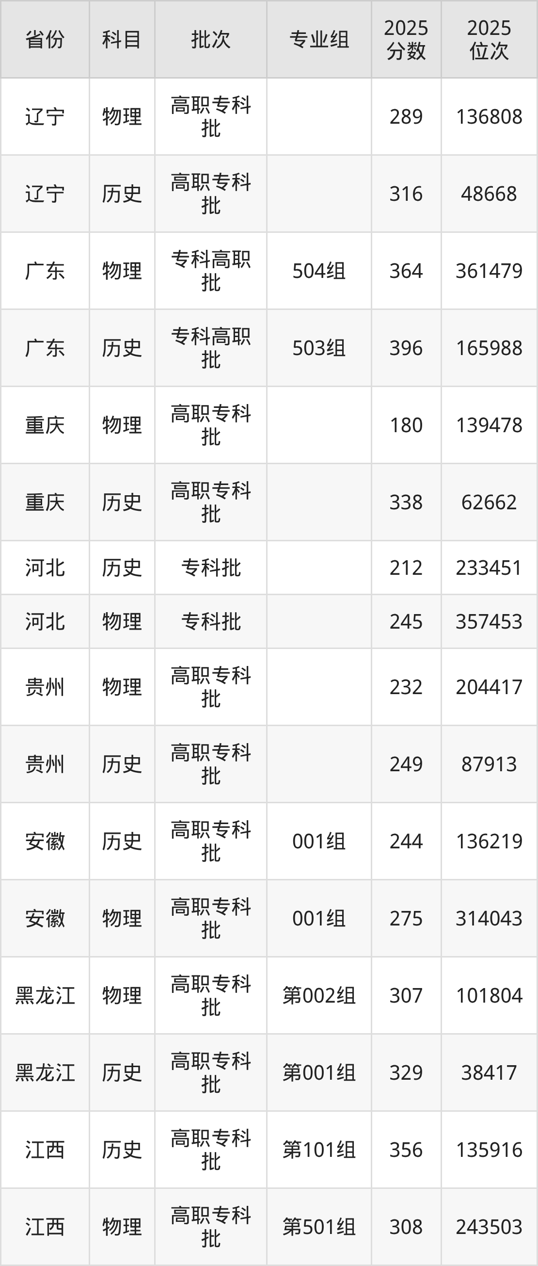 普通类专科物理类最低289分,专科历史类最低316分