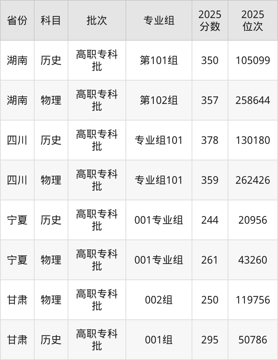 普通类专科历史类最低249分,专科物理类最低232分