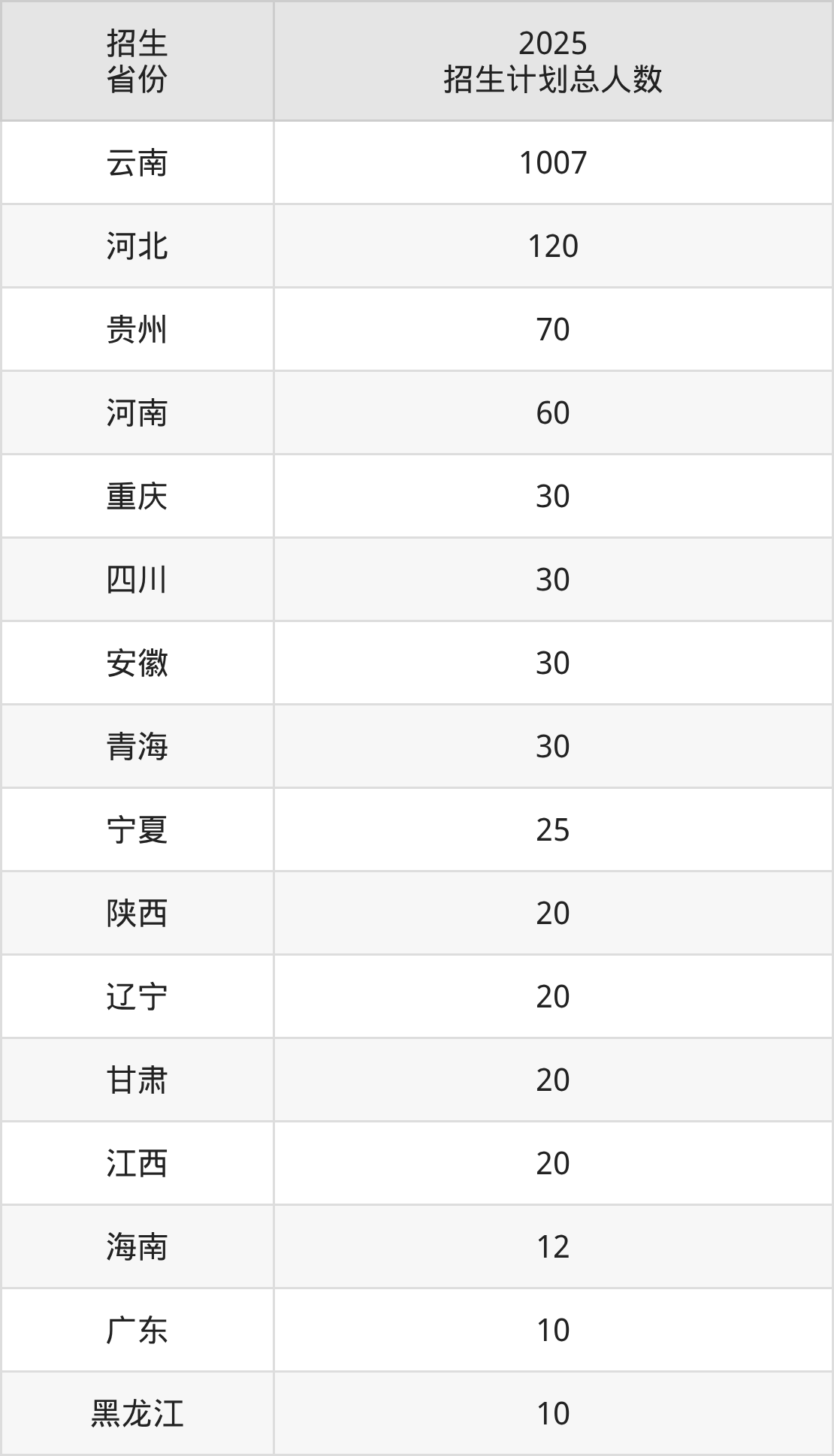 2025年云南新兴职业学院面向全国17个省市开展专科招生;招生专业共35个,招生人数共1520人。2025年在云南省招生计划总人数是1007人,其中,云南新兴职业学院在云南省招生人数最多的是护理。云南新兴职业学院在各省具体招生人数情况如下表。