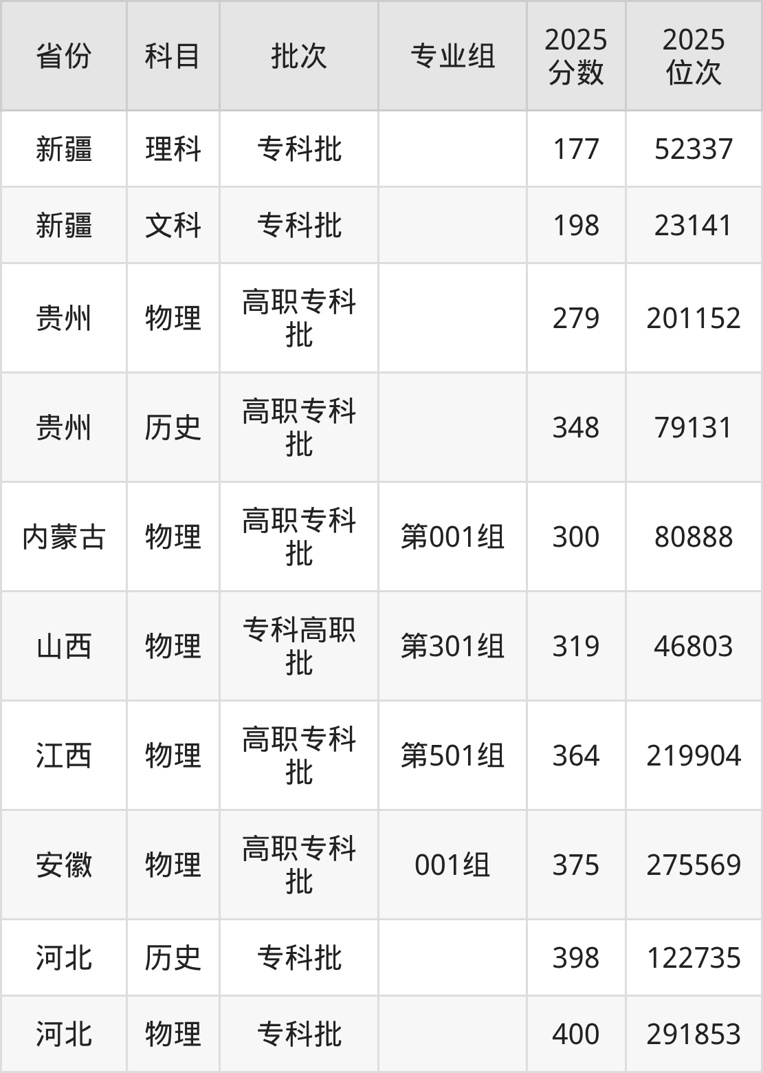 2025年在专科物理类进行招生,各专业组分数线详情如下: