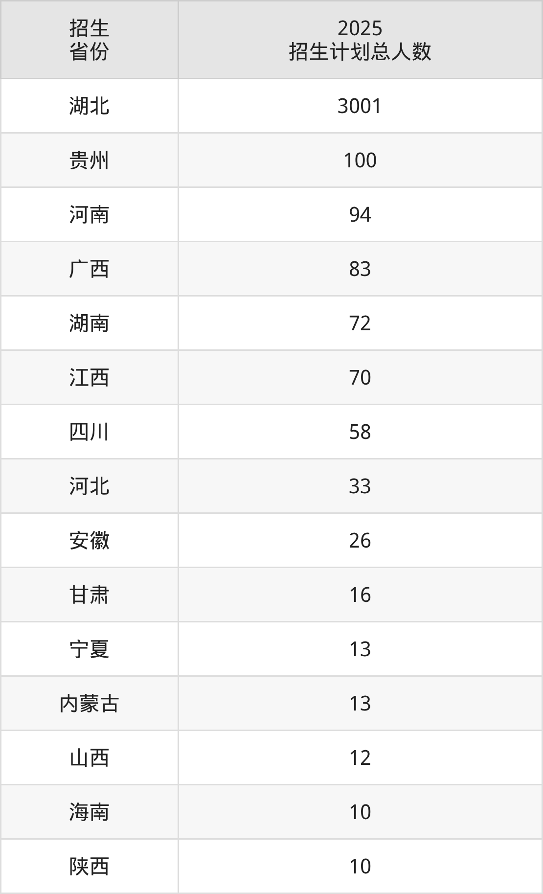 2025年黄冈师范学院面向全国15个省市开展本科招生;招生专业共46个,招生人数共3611人。2025年在湖北省招生计划总人数是3001人,其中,黄冈师范学院在湖北省招生人数最多的是数学与应用数学。黄冈师范学院在各省具体招生人数情况如下表。