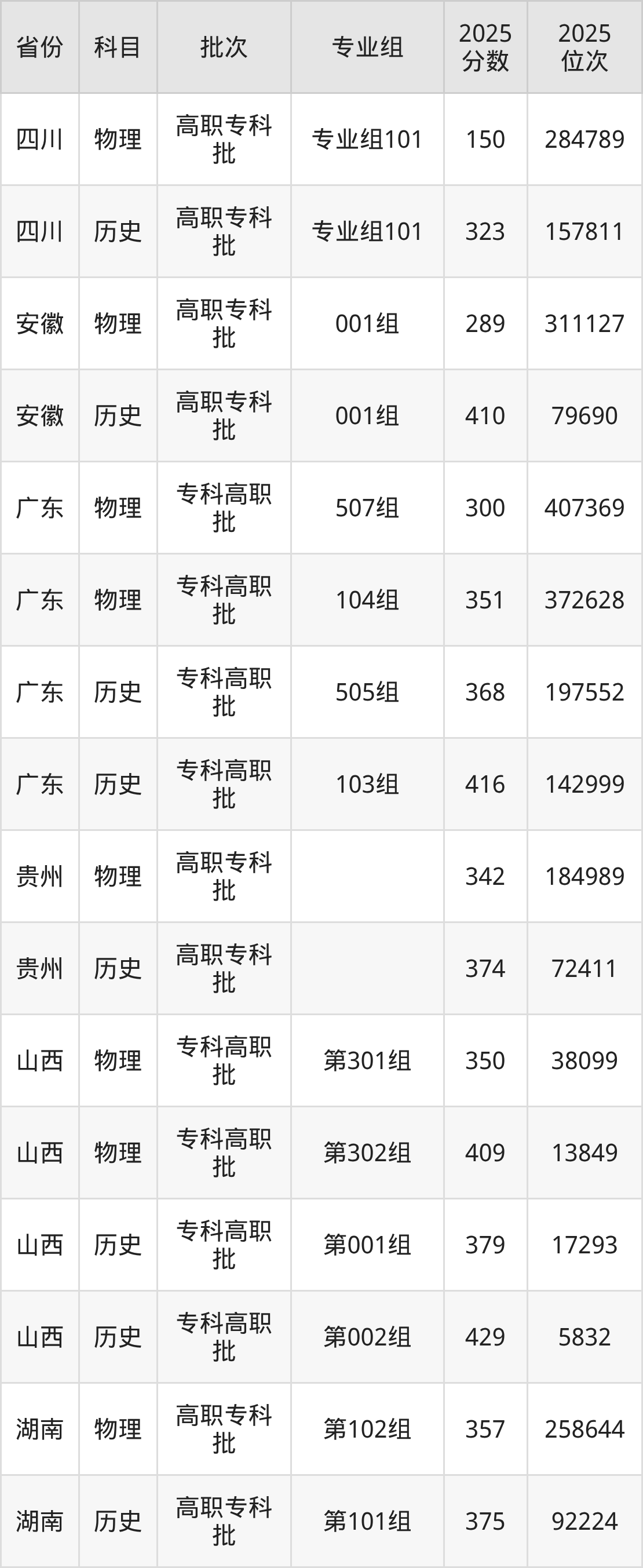 普通类专科物理类最低342分,专科历史类最低374分