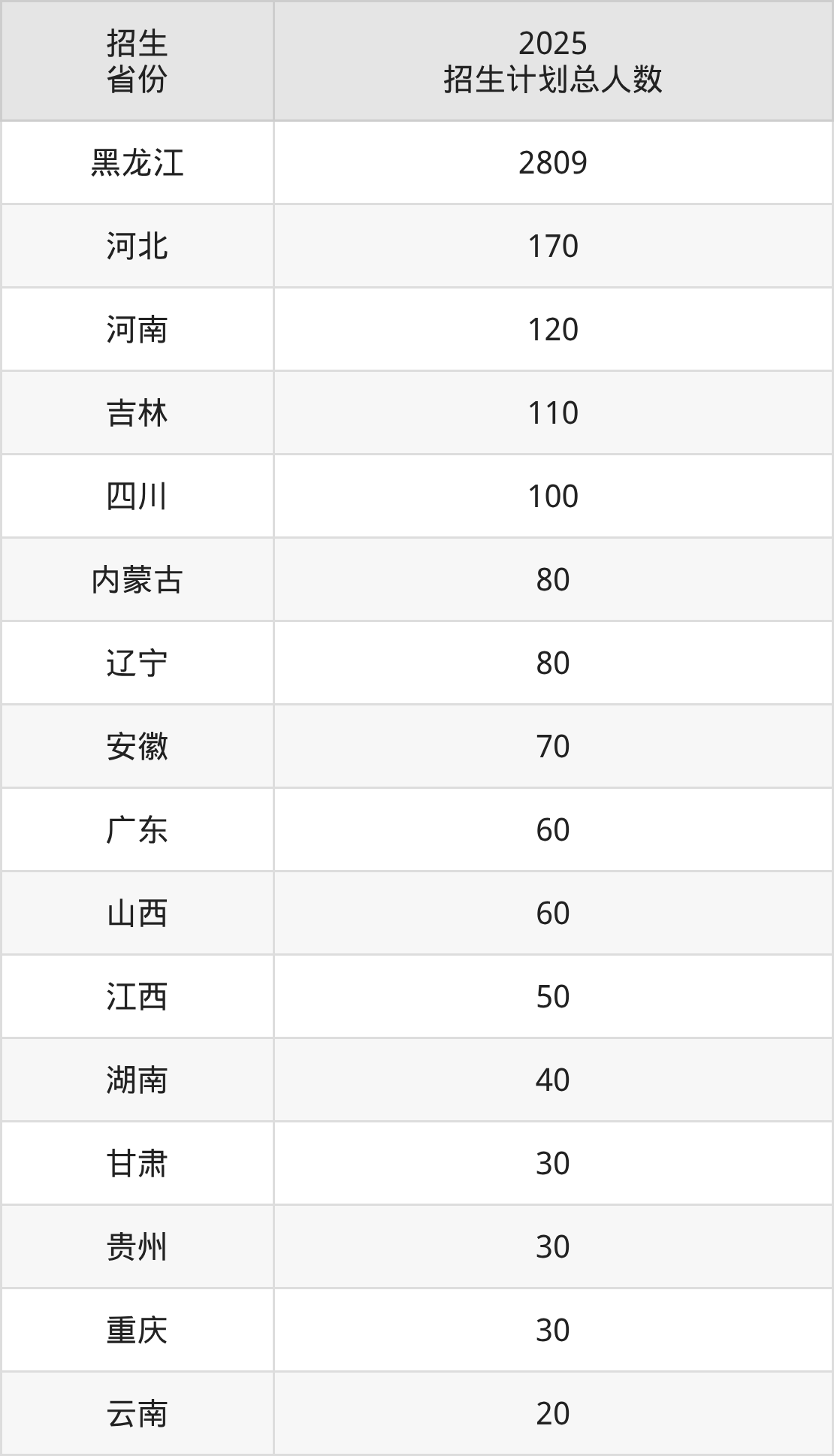 2025年黑龙江护理高等专科学校面向全国16个省市开展专科招生;招生专业共20个,招生人数共3859人。2025年在黑龙江省招生计划总人数是2809人,其中,黑龙江护理高等专科学校在黑龙江省招生人数最多的是护理。黑龙江护理高等专科学校在各省具体招生人数情况如下表。