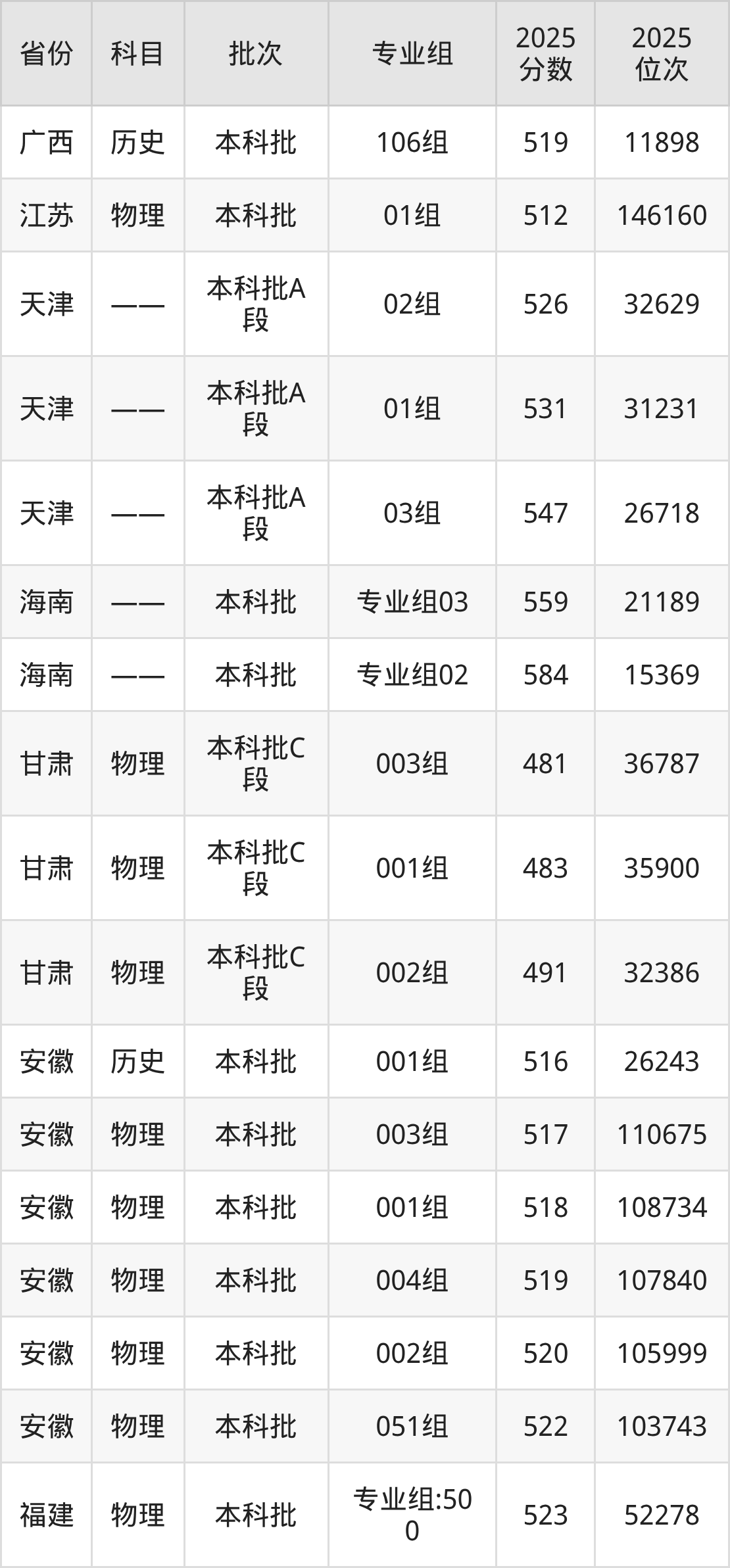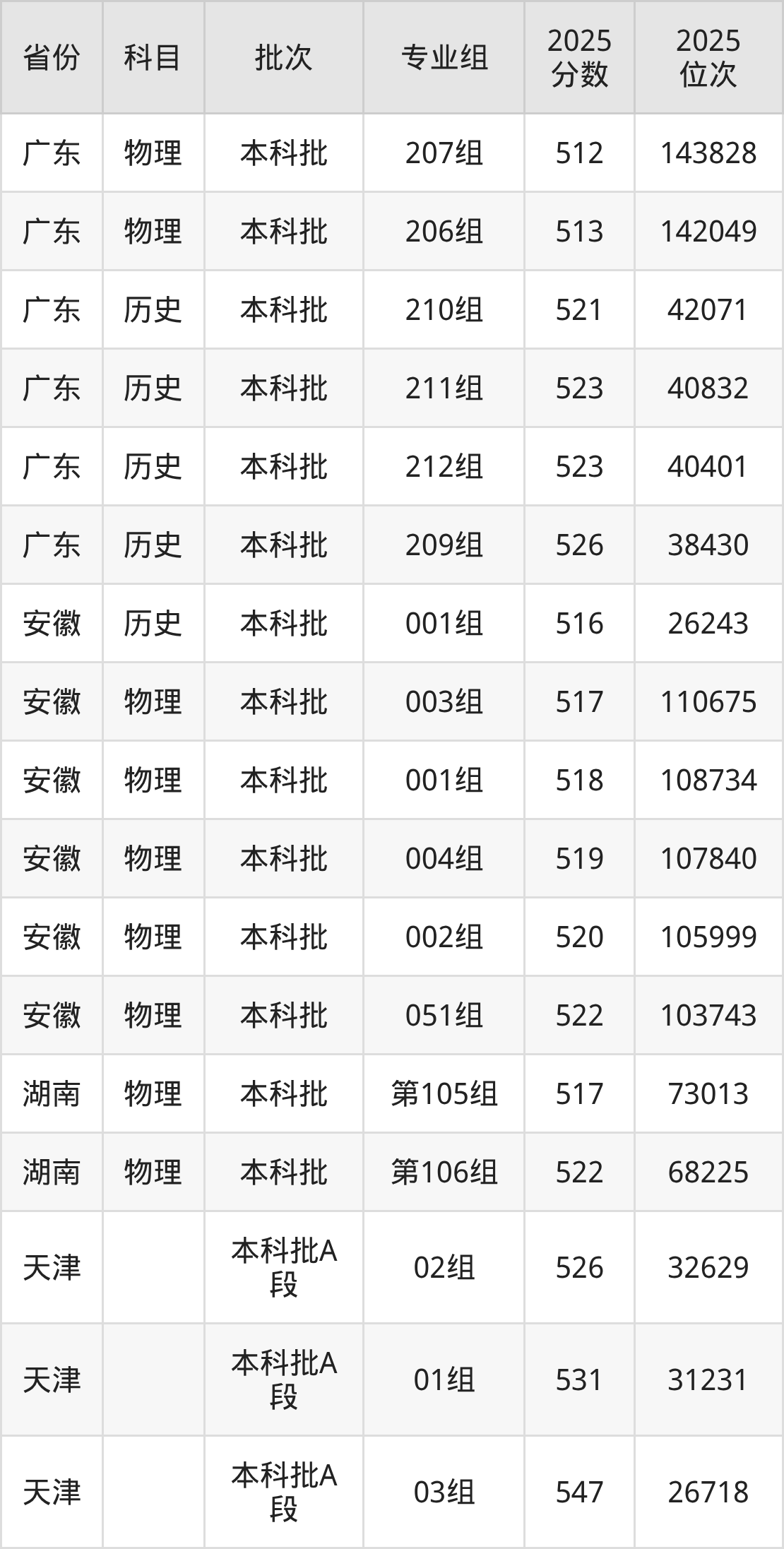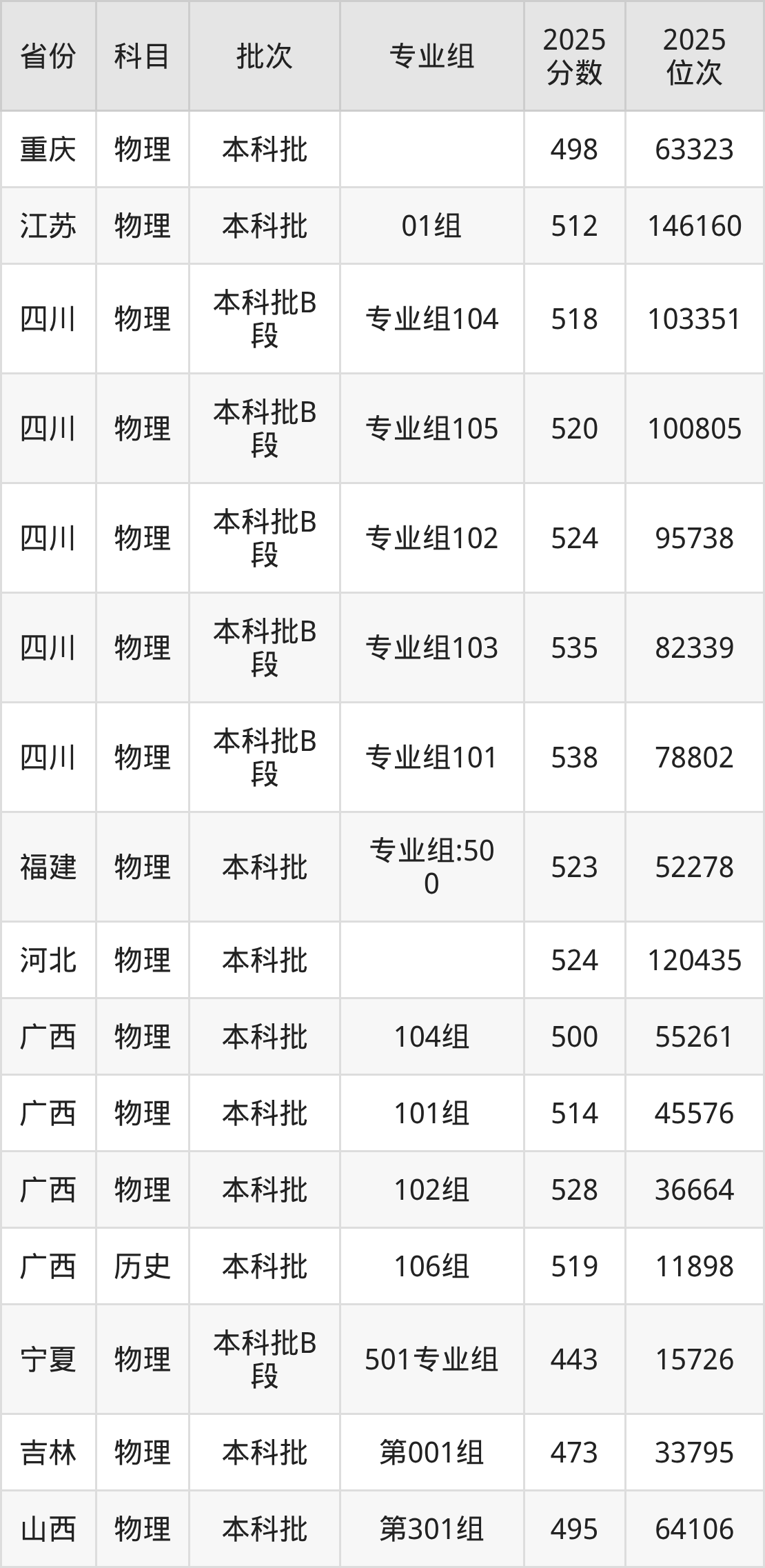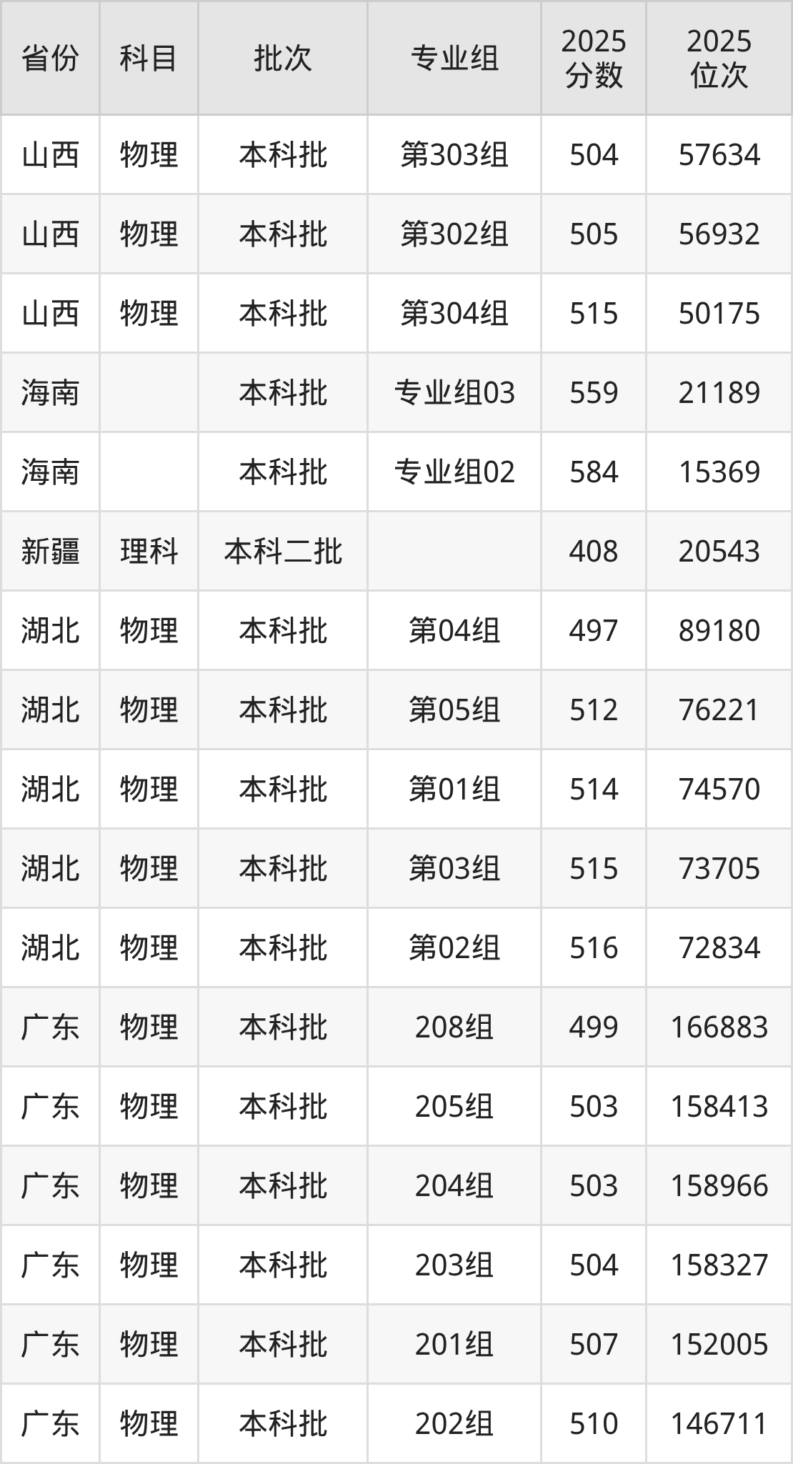 2025年在本科物理类进行招生,各专业组分数线详情如下: