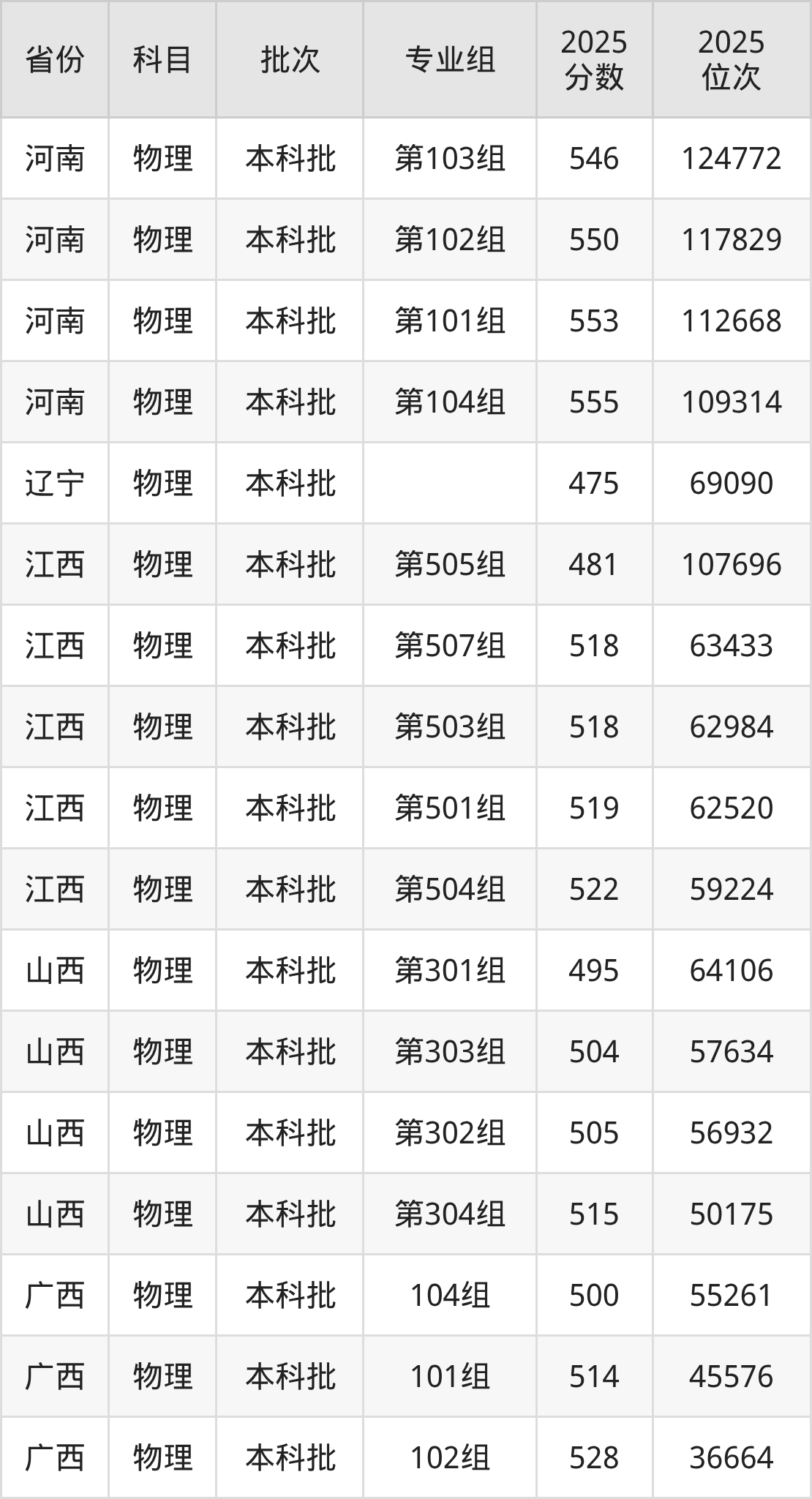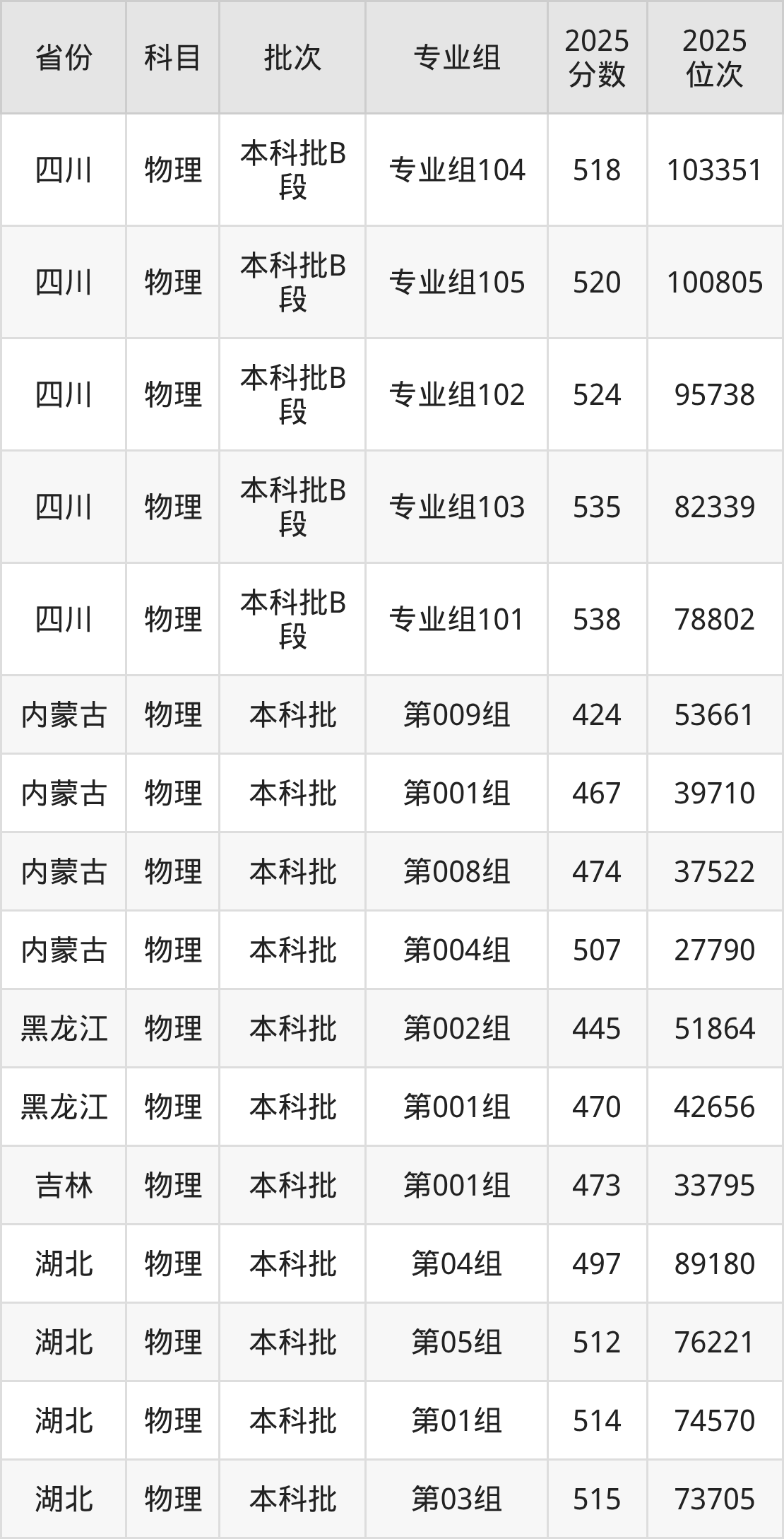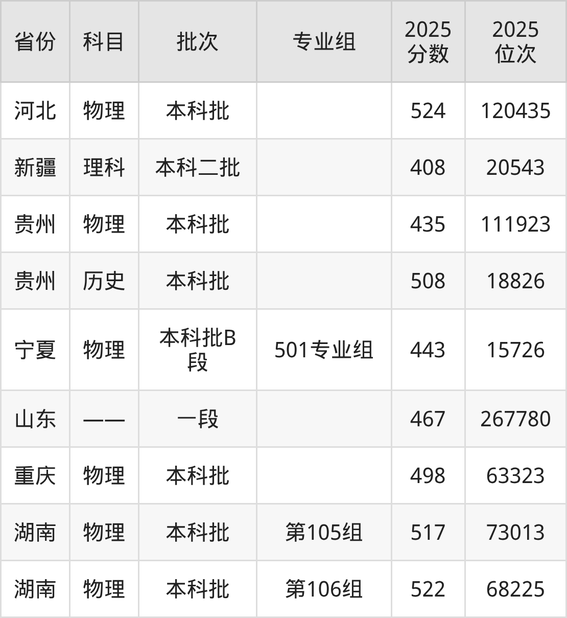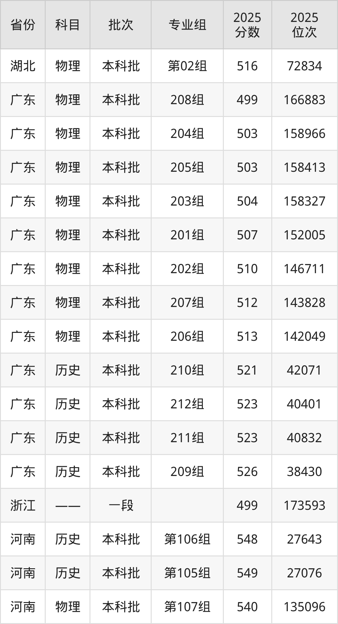 2025年在本科物理类进行招生,各专业组分数线详情如下: