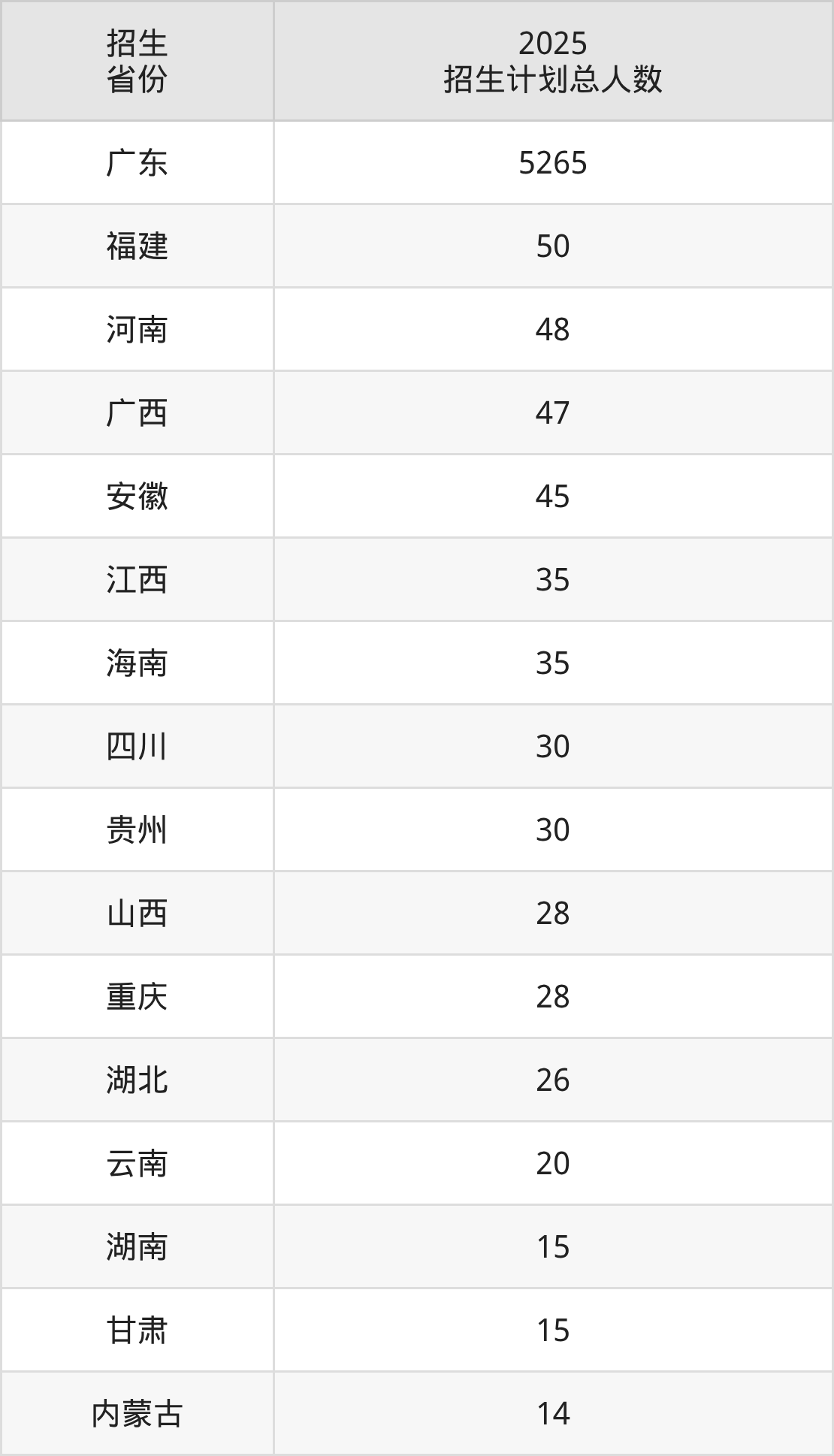 2025年广东石油化工学院面向全国25个省市开展本科招生;招生专业共55个,招生人数共5820人。2025年在广东省招生计划总人数是5265人,其中,广东石油化工学院在广东省招生人数最多的是化学工程与工艺。广东石油化工学院在各省具体招生人数情况如下表。