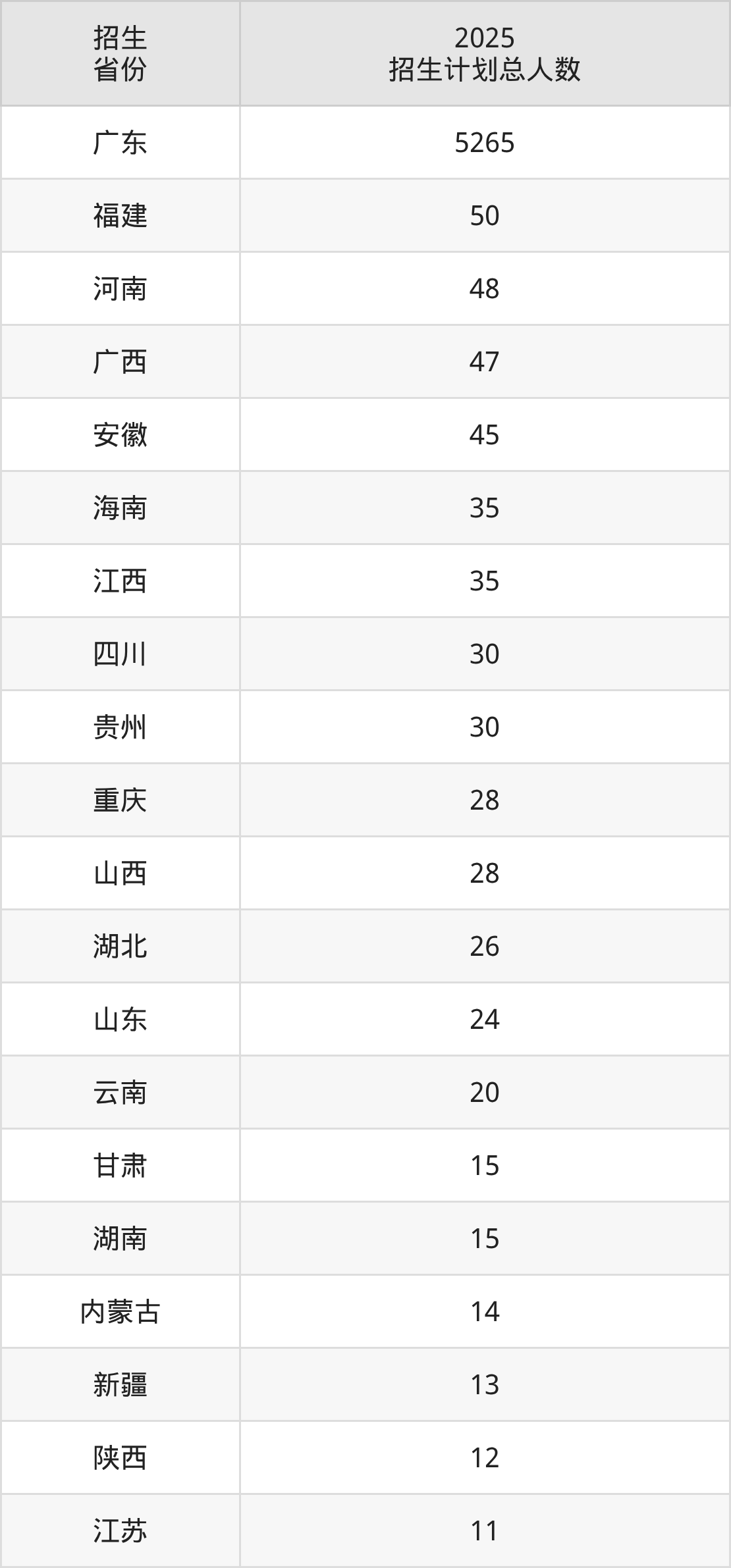 2025年广东石油化工学院面向全国26个省市开展本科招生;招生专业共55个,招生人数共5844人。2025年在广东省招生计划总人数是5265人,其中,广东石油化工学院在广东省招生人数最多的是化学工程与工艺。广东石油化工学院在各省具体招生人数情况如下表。