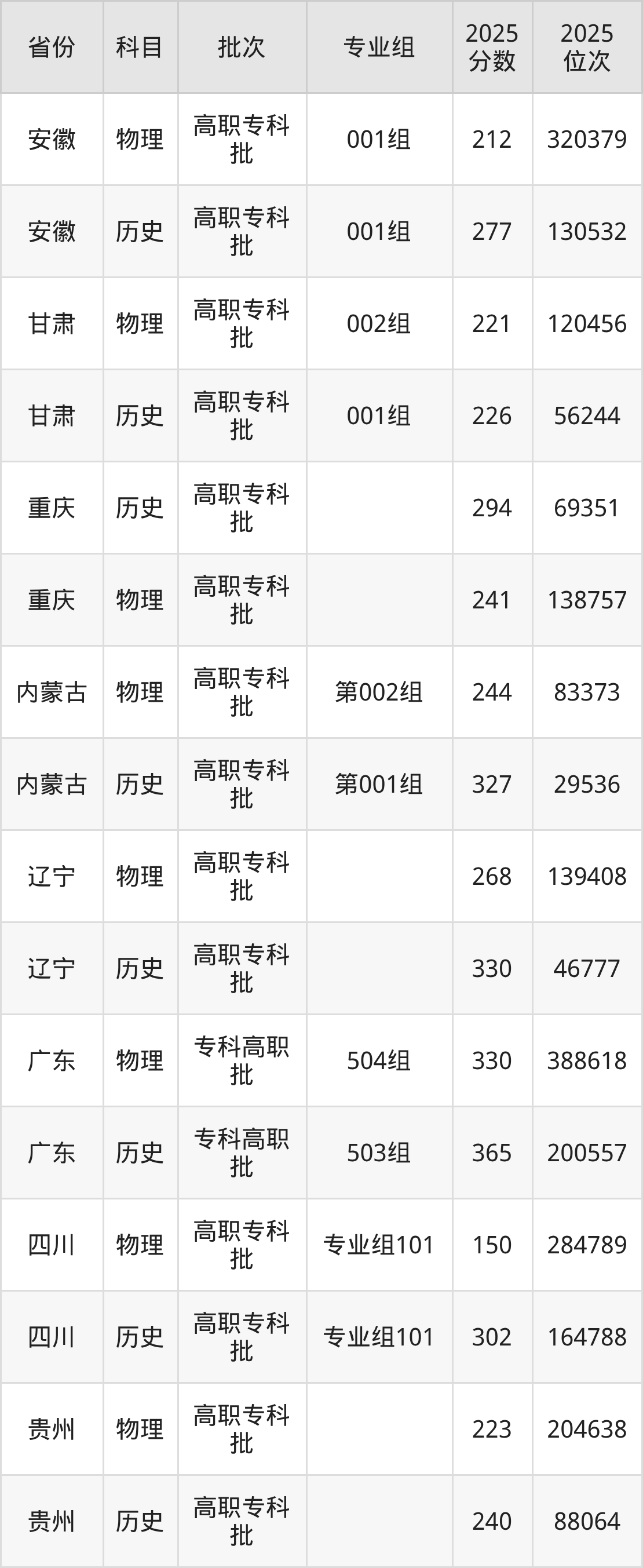 普通类专科物理类最低223分,专科历史类最低240分