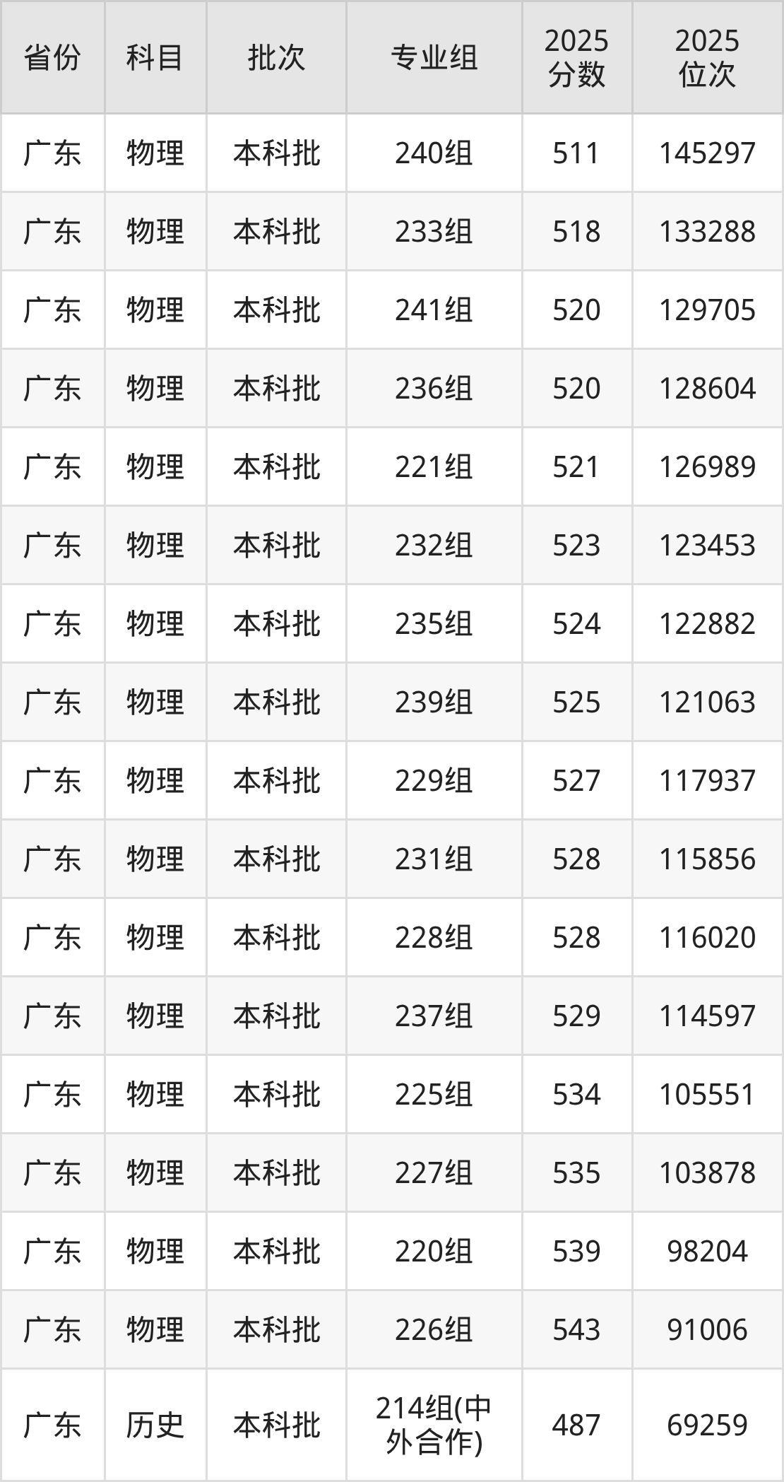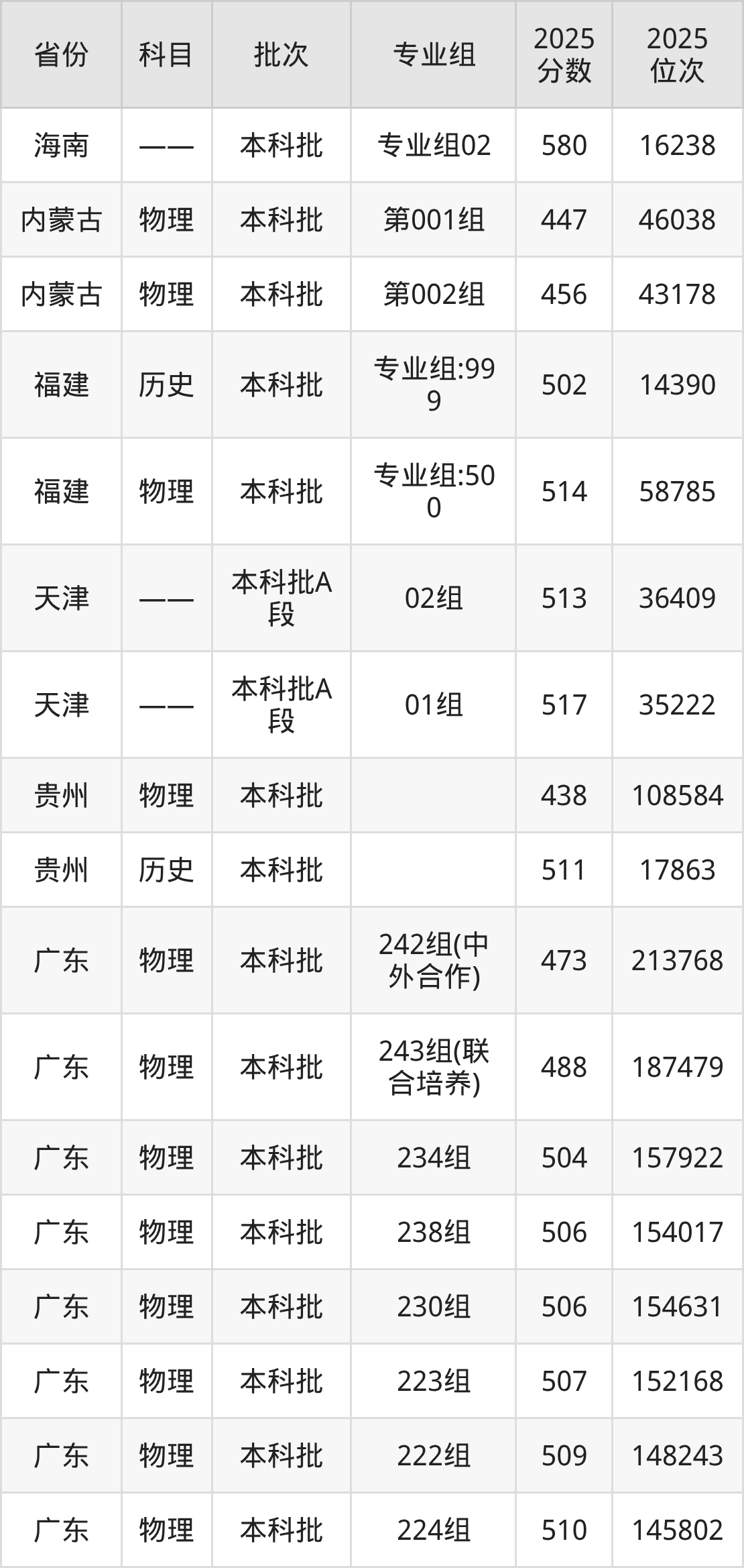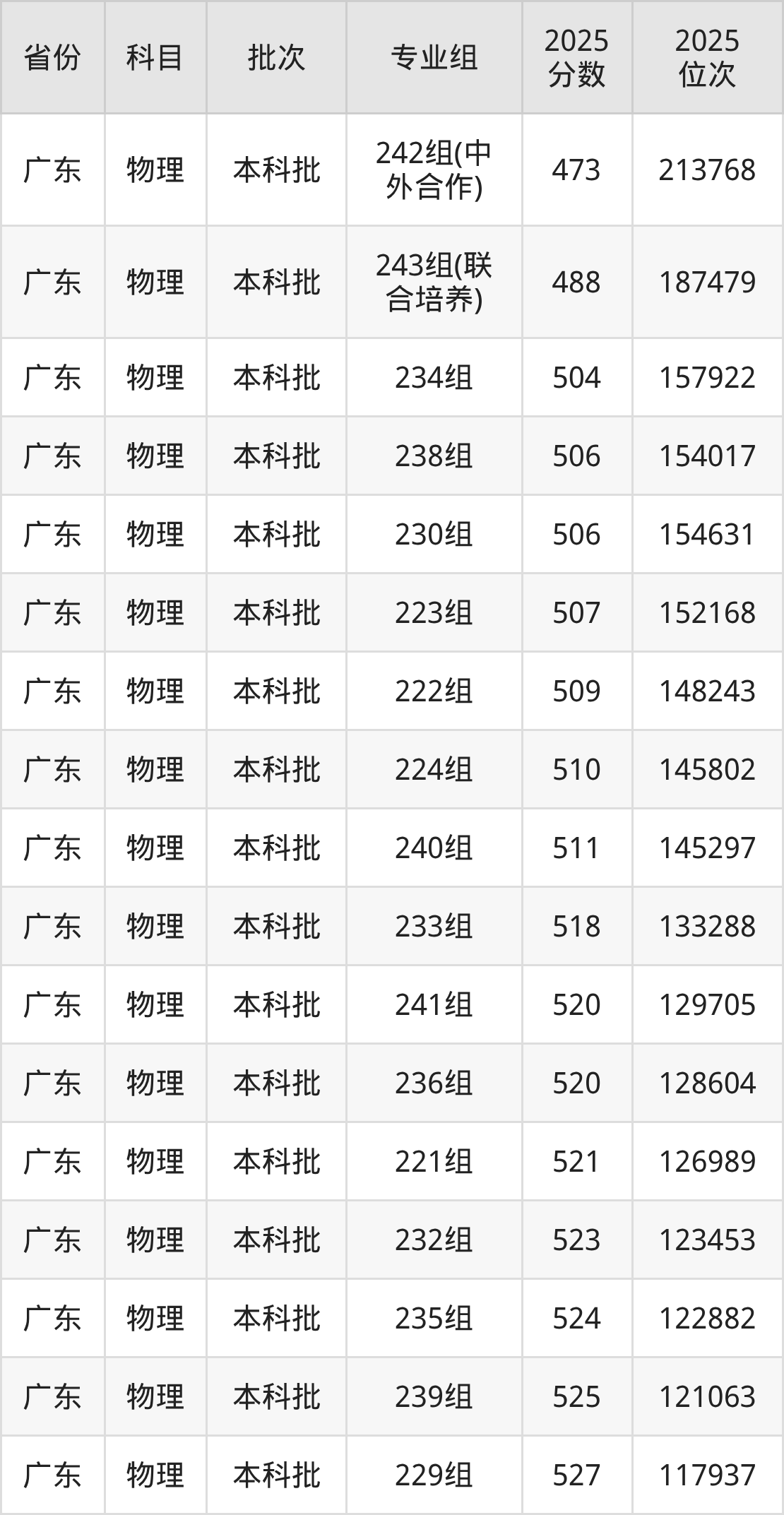 2025年在本科物理类进行招生,各专业组分数线详情如下: