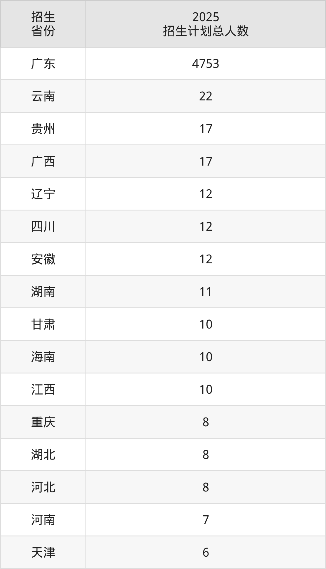2025年惠州学院面向全国18个省市开展本科招生;招生专业共40个,招生人数共4933人。2025年在广东省招生计划总人数是4753人,其中,惠州学院在广东省招生人数最多的是计算机类。惠州学院在各省具体招生人数情况如下表。