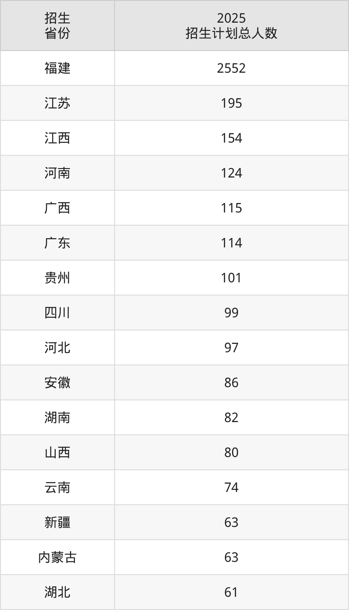 2025年厦门大学嘉庚学院面向全国28个省市开展本科招生;招生专业共43个,招生人数共4555人。2025年在福建省招生计划总人数是2552人,其中,厦门大学嘉庚学院在福建省招生人数最多的是建筑学。厦门大学嘉庚学院在各省具体招生人数情况如下表。