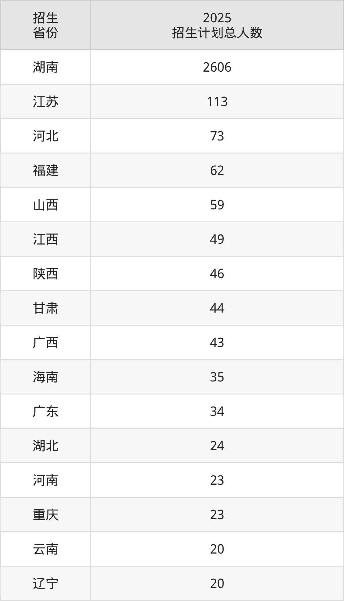 2025年湘南学院面向全国25个省市开展本科招生;招生专业共37个,招生人数共3412人。2025年在湖南省招生计划总人数是2606人,其中,湘南学院在湖南省招生人数最多的是临床医学。湘南学院在各省具体招生人数情况如下表。