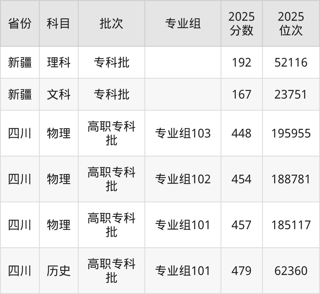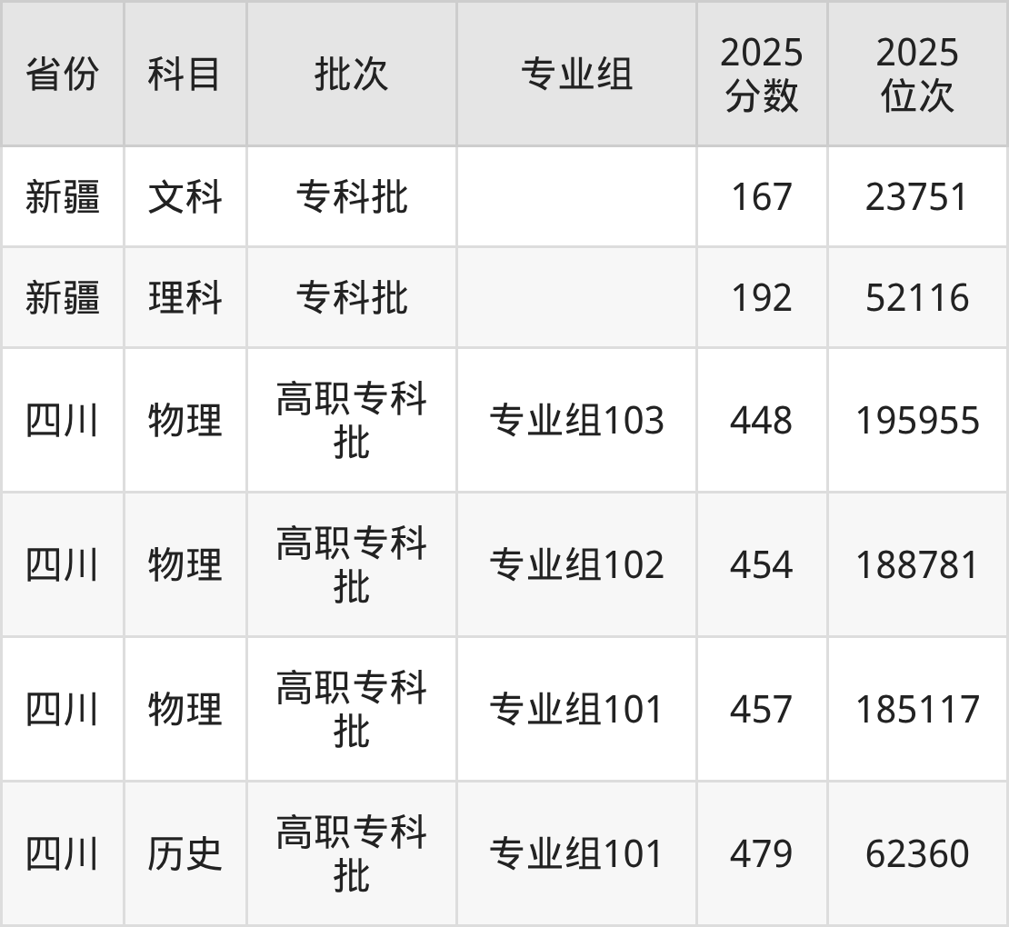 2025年四川邮电职业技术学院全国录取分数线是167分到479分,录取最低在新疆文科、录取最高在四川历史类(专业组101)。各省各专业组最低分具有差异,详情如下: