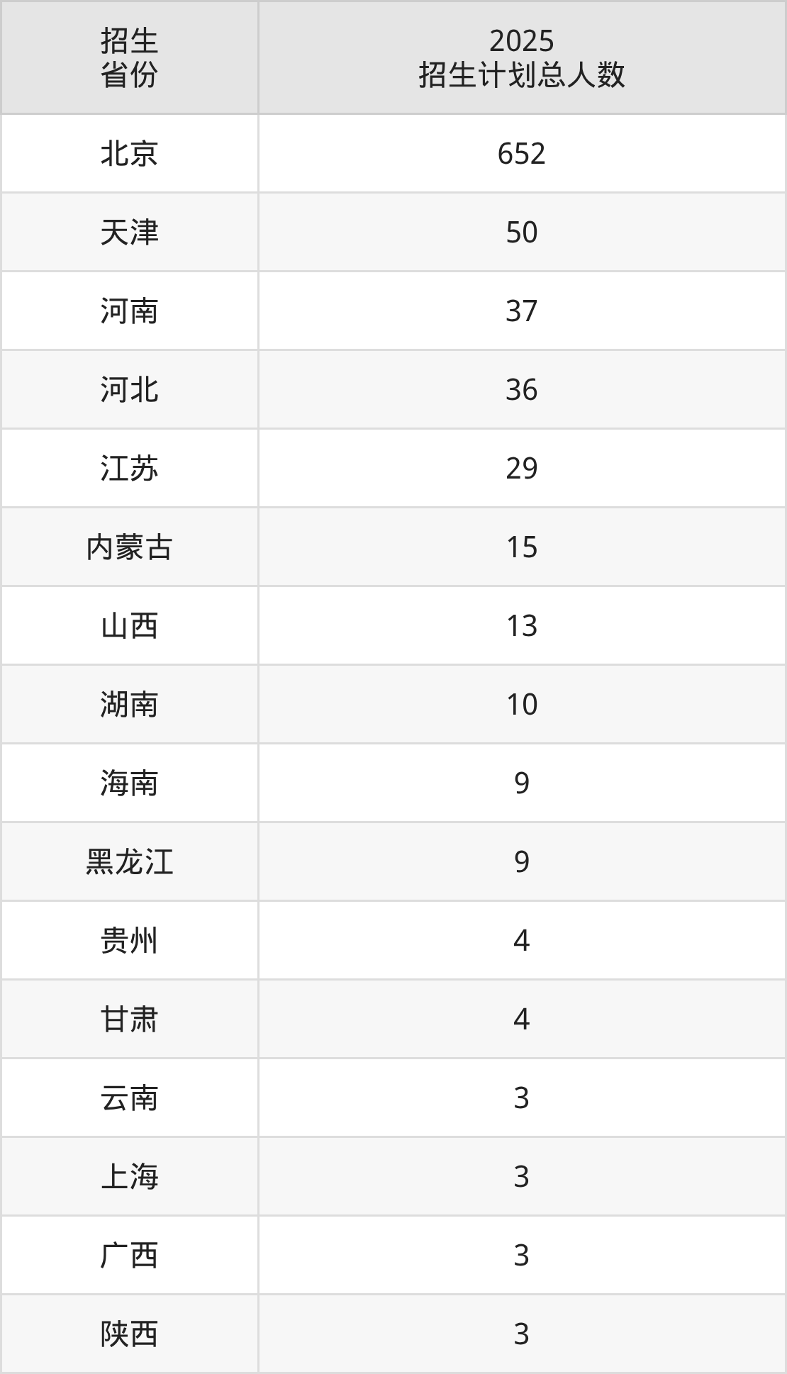 2025年北京金融科技学院面向全国20个省市开展本科招生;招生专业共15个,招生人数共888人。2025年在北京市招生计划总人数是652人,其中,北京金融科技学院在北京市招生人数最多的是会计学。北京金融科技学院在各省具体招生人数情况如下表。