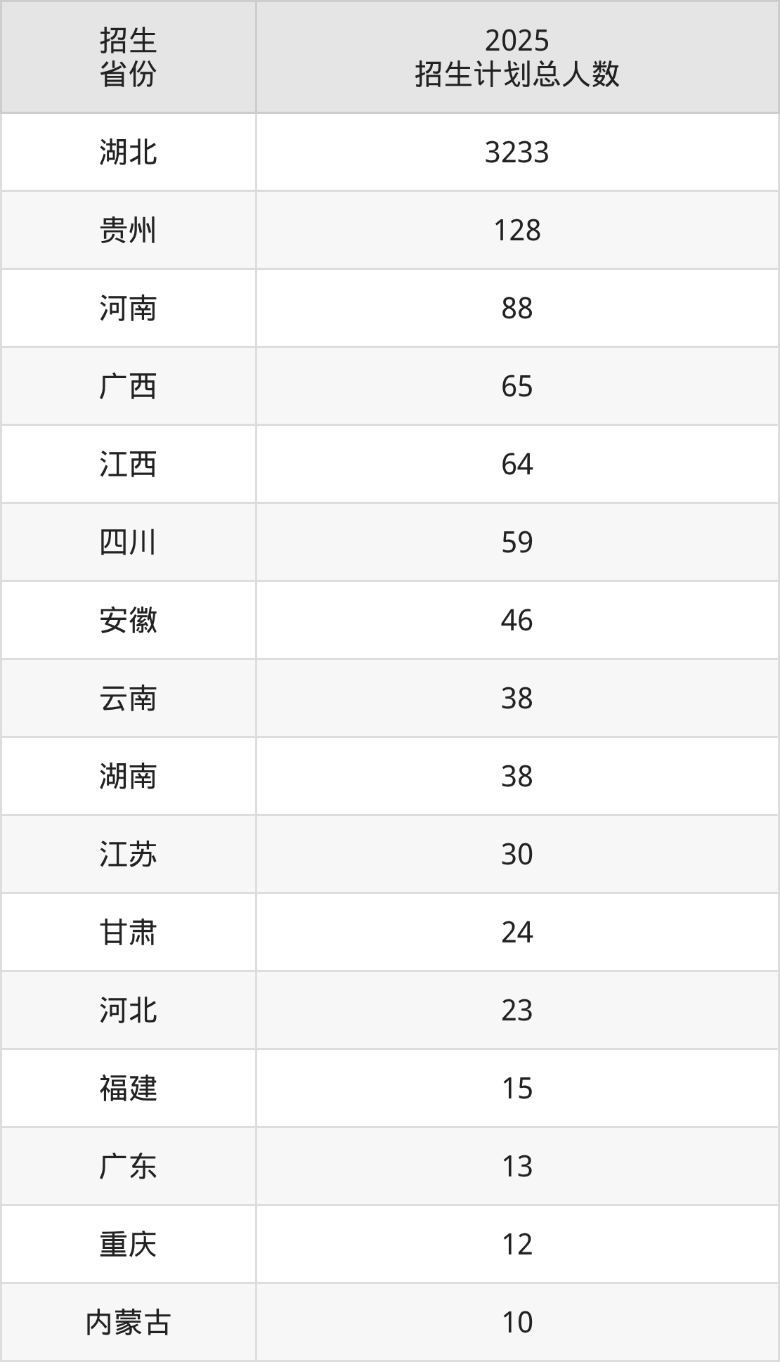 2025年湖北第二师范学院面向全国18个省市开展本科招生;招生专业共36个,招生人数共3903人。2025年在湖北省招生计划总人数是3233人,其中,湖北第二师范学院在湖北省招生人数最多的是计算机类。湖北第二师范学院在各省具体招生人数情况如下表。