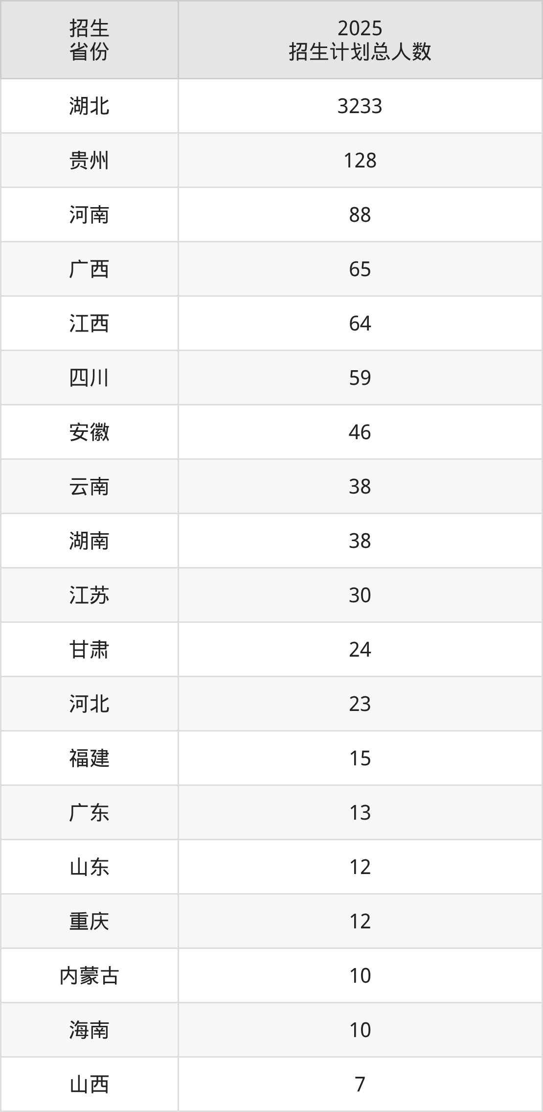 2025年湖北第二师范学院面向全国19个省市开展本科招生;招生专业共36个,招生人数共3915人。2025年在湖北省招生计划总人数是3233人,其中,湖北第二师范学院在湖北省招生人数最多的是计算机类。湖北第二师范学院在各省具体招生人数情况如下表。
