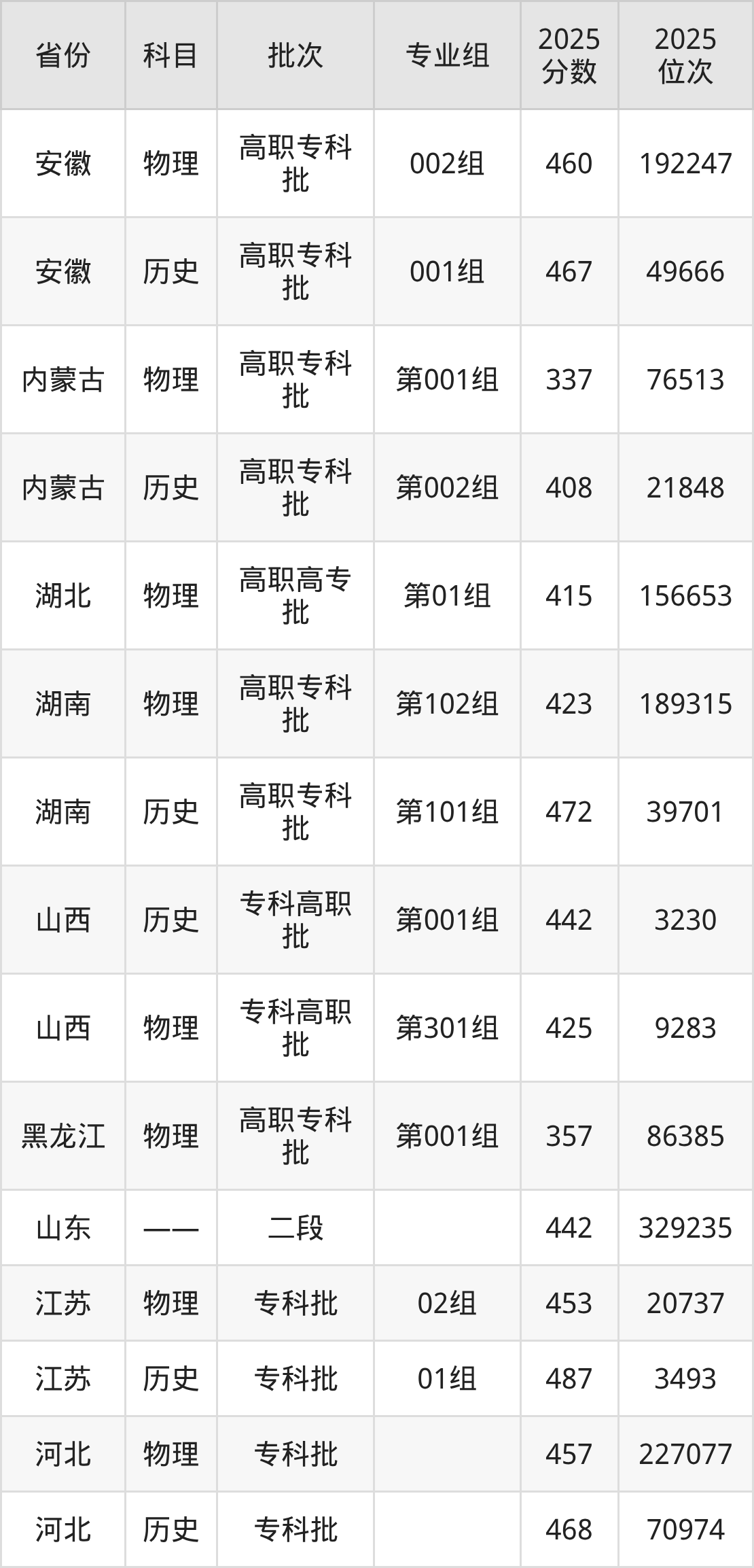 2025年在专科物理类进行招生,各专业组分数线详情如下: