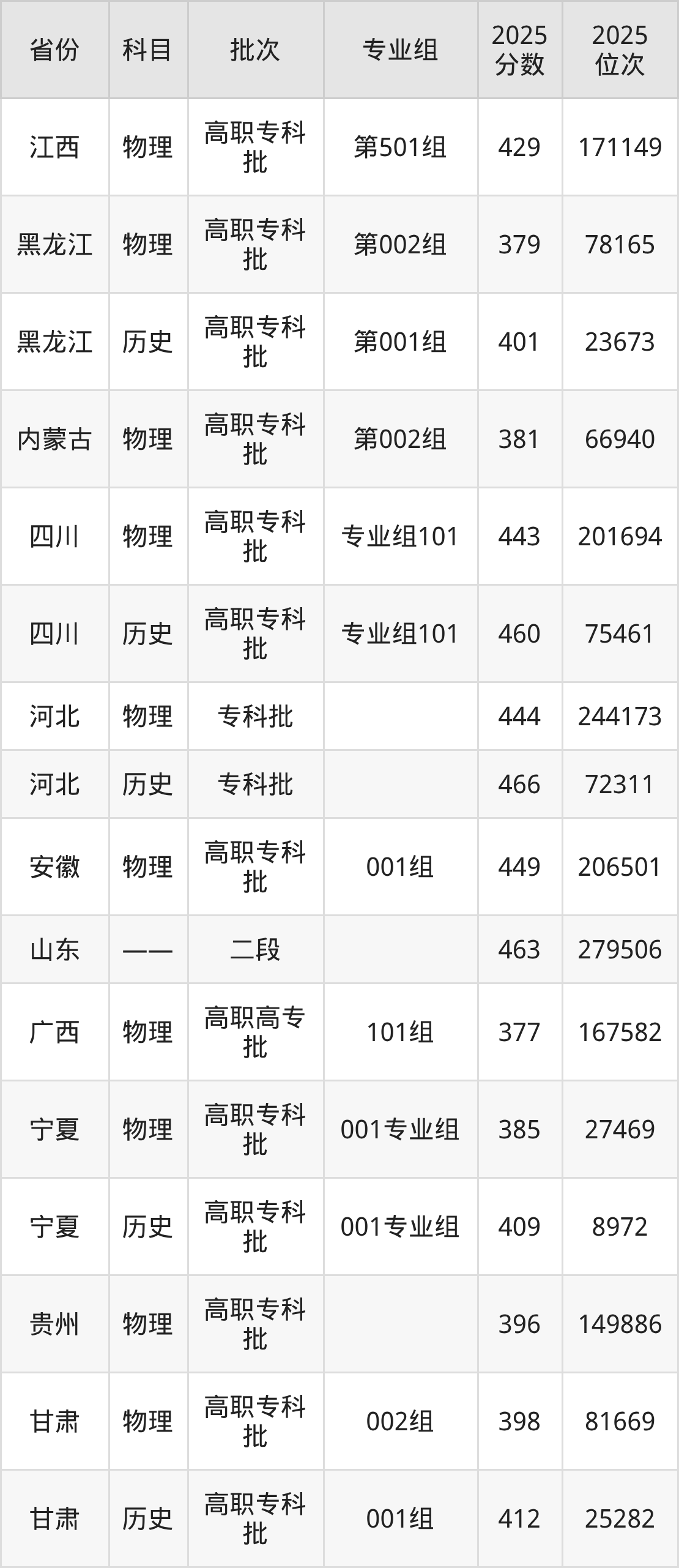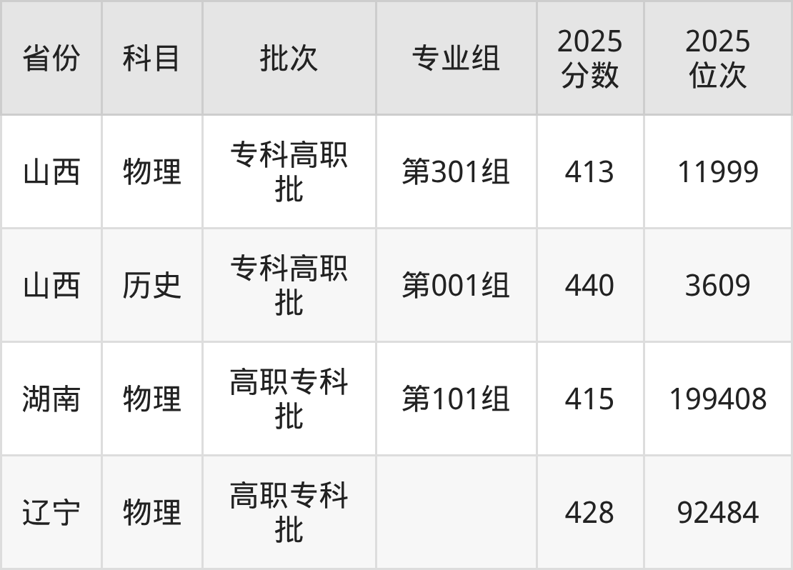 2025年在专科物理类进行招生,各专业组分数线详情如下: