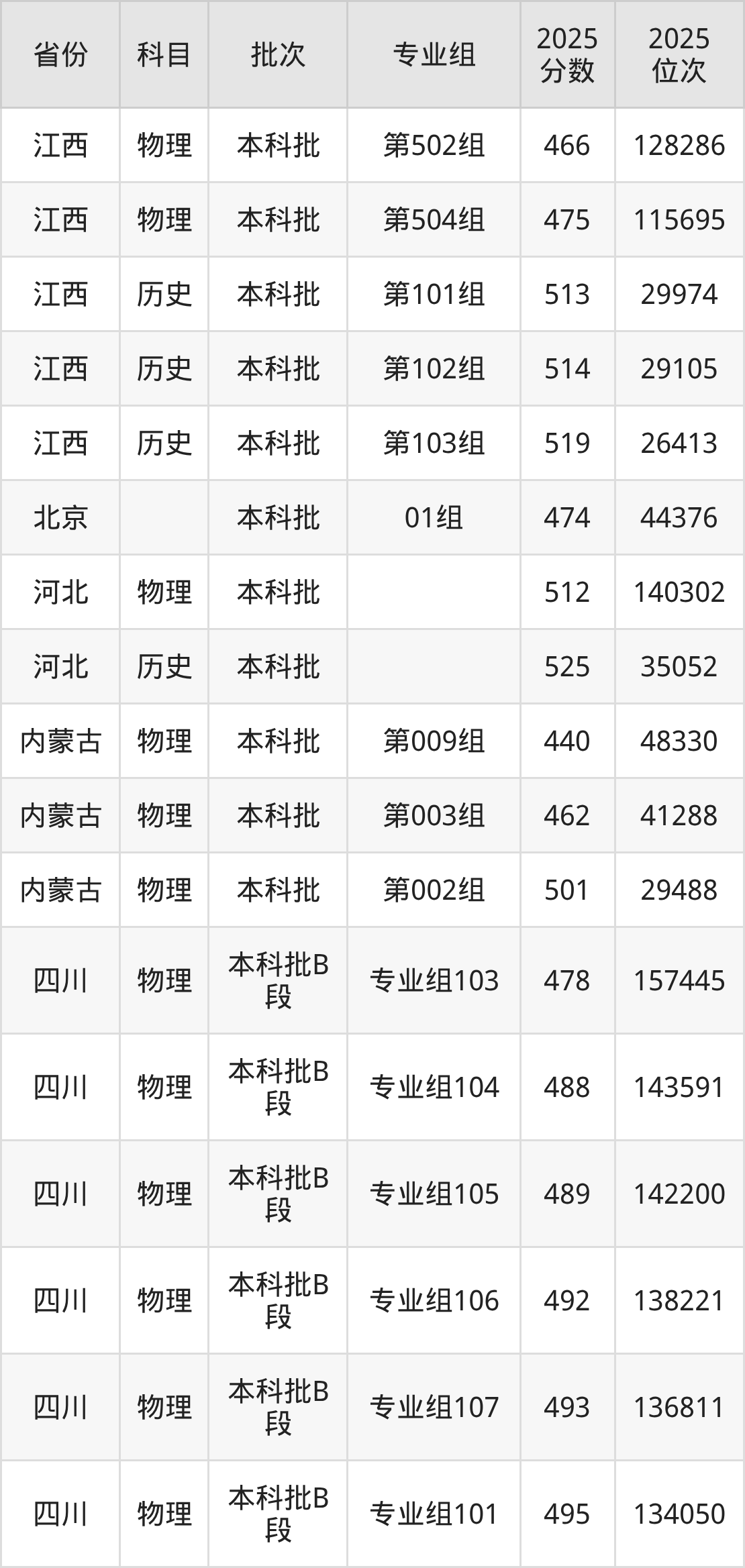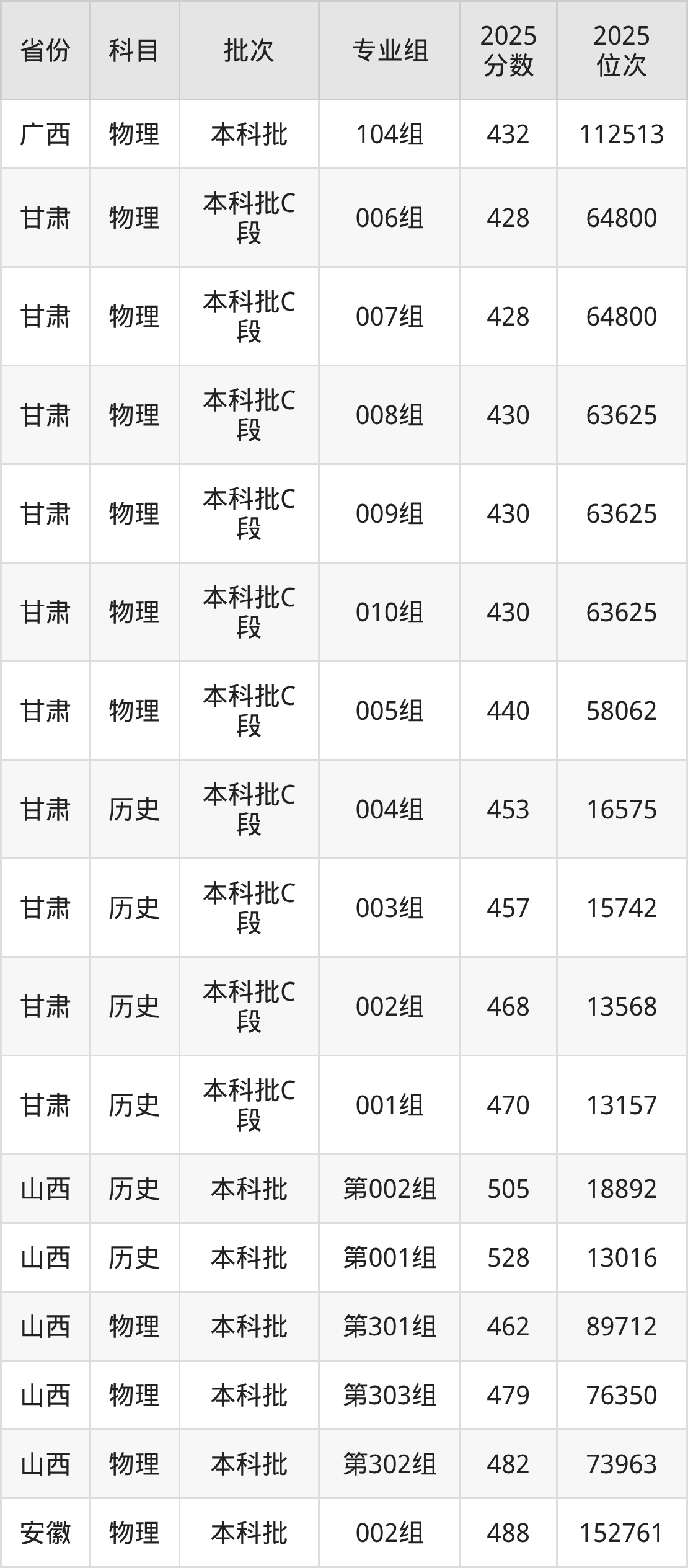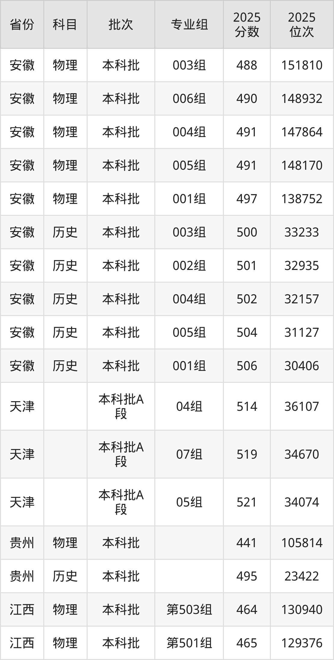 2025年在本科物理类进行招生,各专业组分数线详情如下: