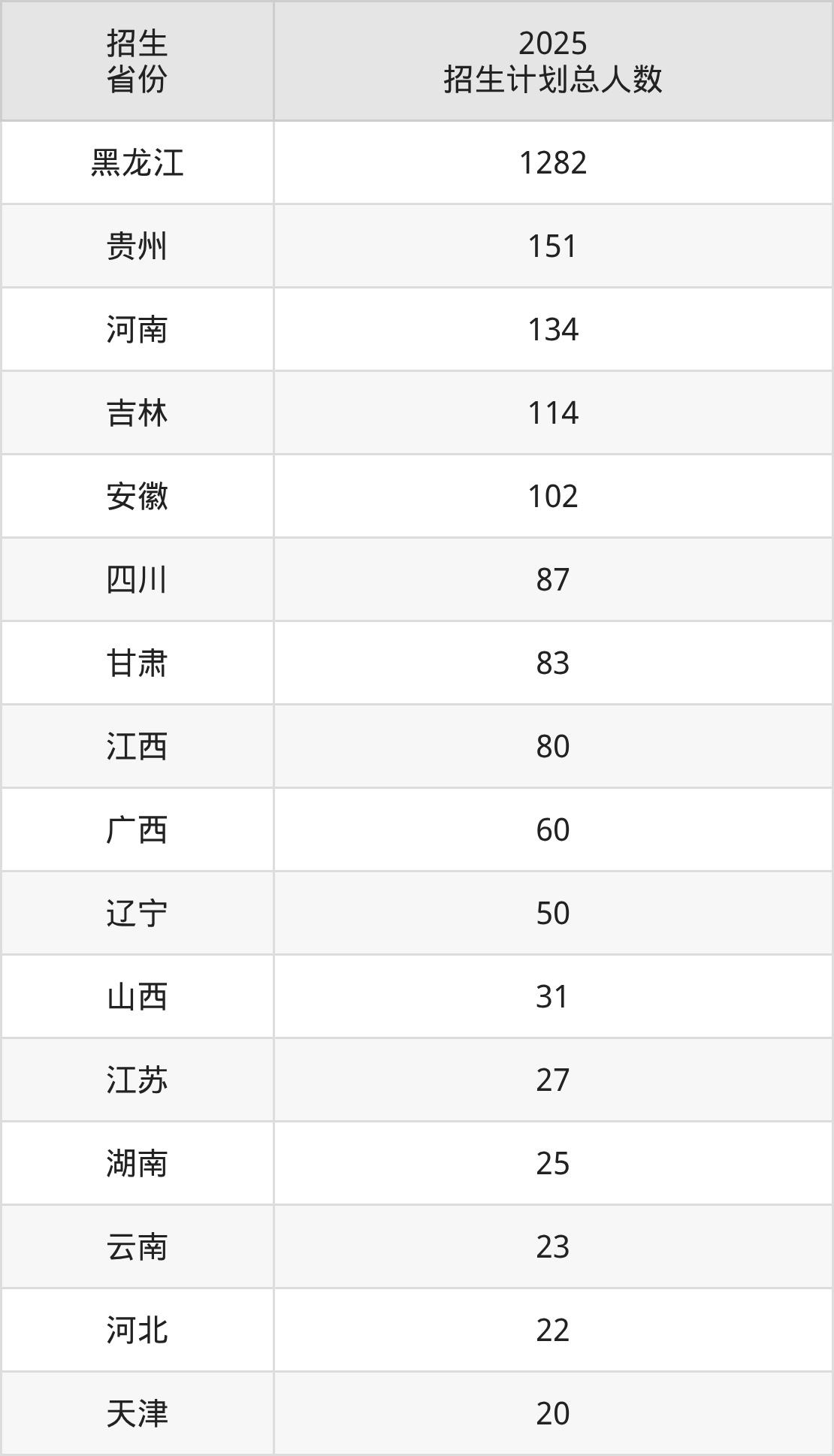 2025年大庆师范学院面向全国19个省市开展本科招生;招生专业共29个,招生人数共2329人。2025年在黑龙江省招生计划总人数是1282人,其中,大庆师范学院在黑龙江省招生人数最多的是物联网工程。大庆师范学院在各省具体招生人数情况如下表。