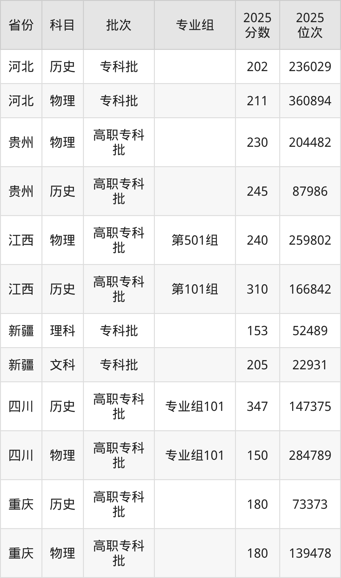 2025年重庆能源职业学院全国录取分数线是150分到364分,录取最低在四川物理类(专业组101)、录取最高在河北物理类。各省各专业组最低分具有差异,详情如下: