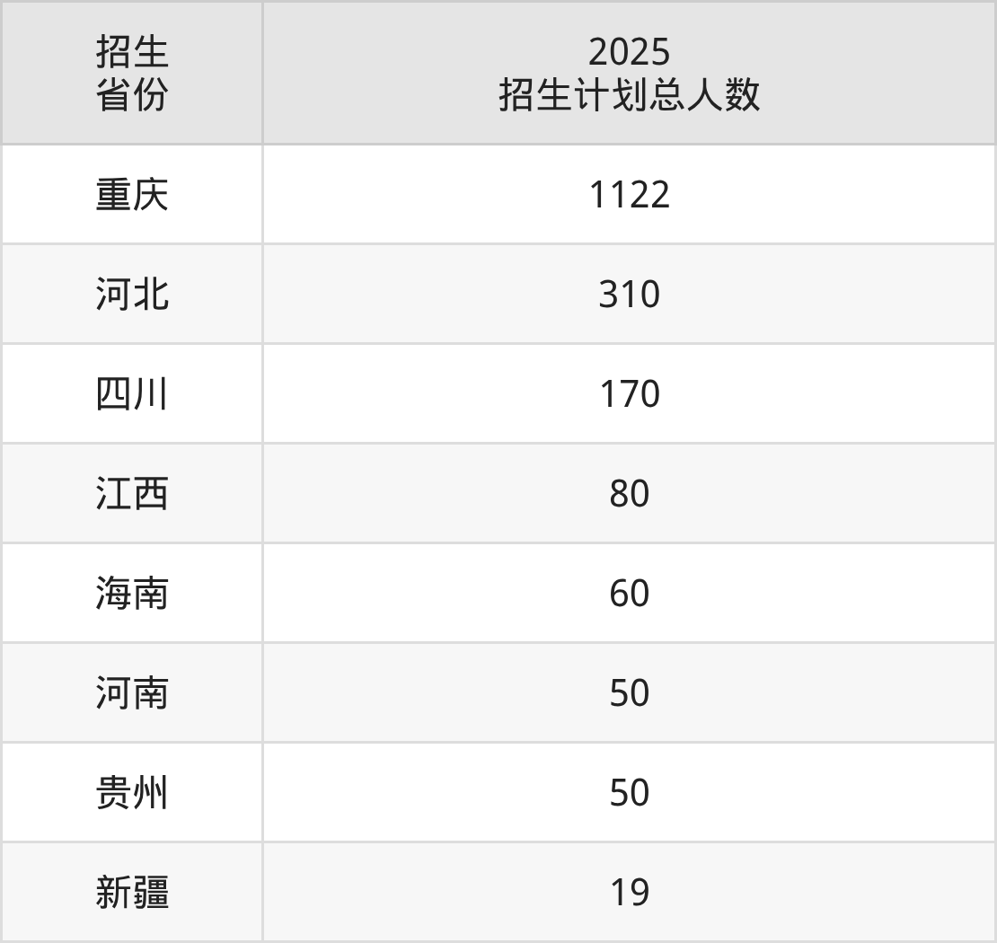 2025年重庆能源职业学院面向全国8个省市开展专科招生;招生专业共33个,招生人数共1861人。2025年在重庆市招生计划总人数是1122人,其中,重庆能源职业学院在重庆市招生人数最多的是护理。重庆能源职业学院在各省具体招生人数情况如下表。