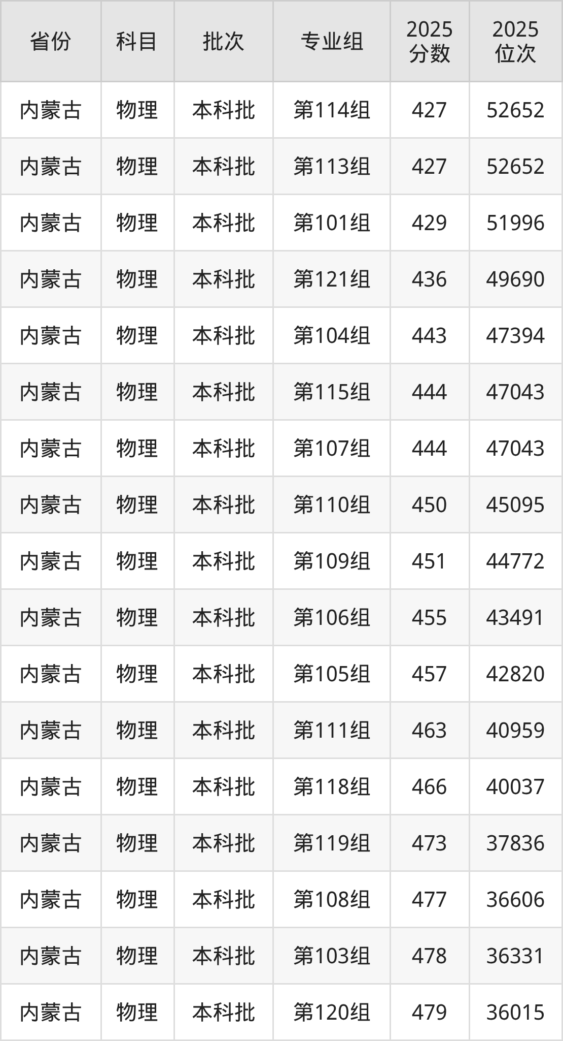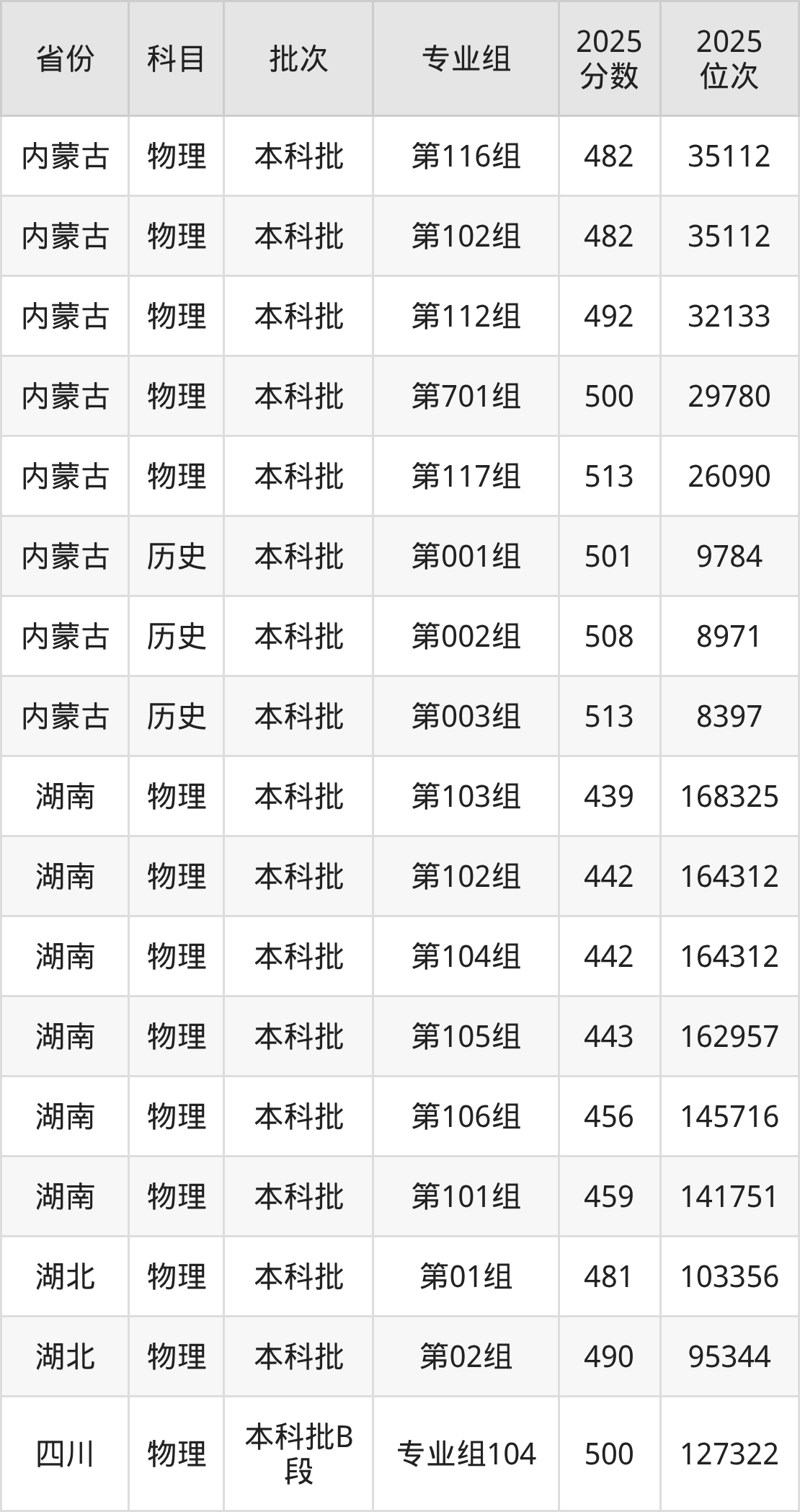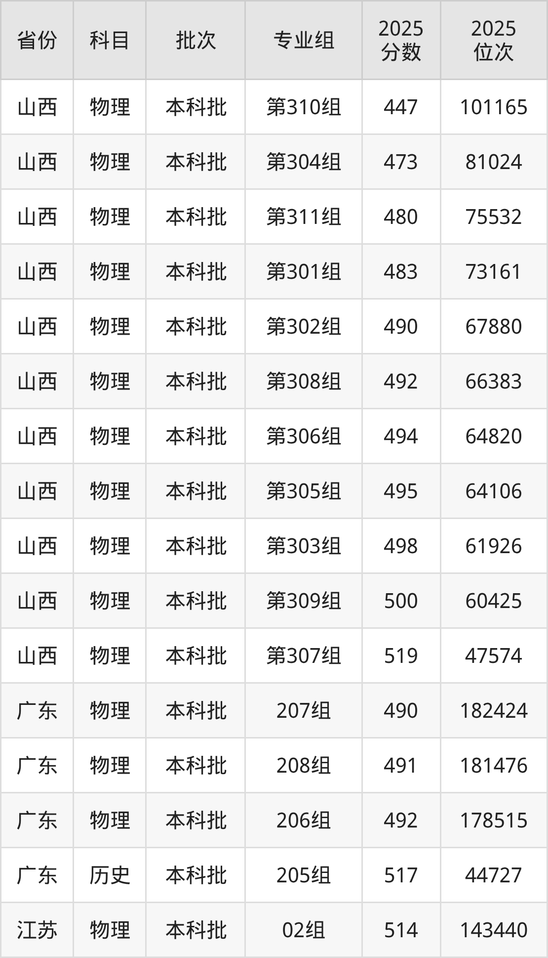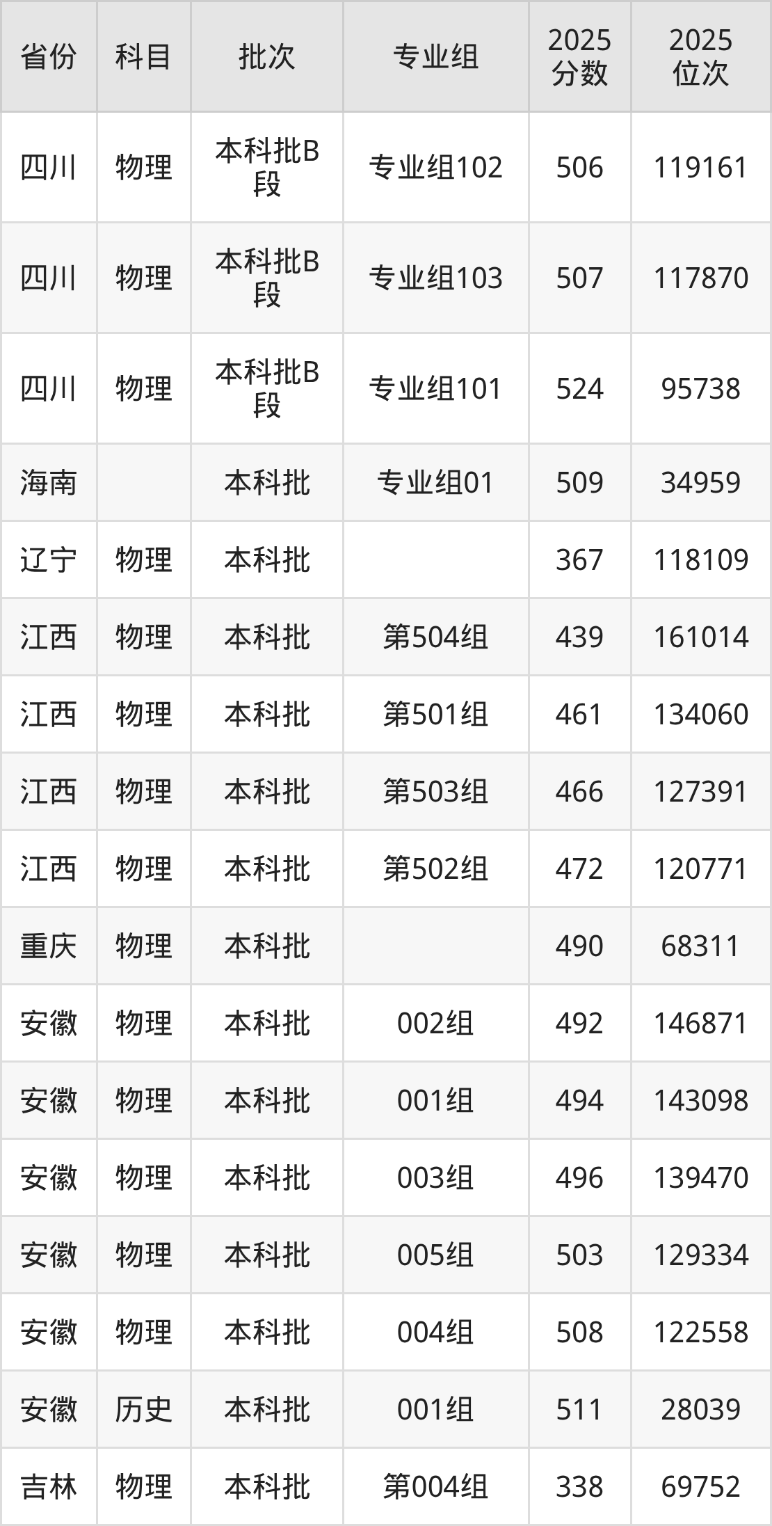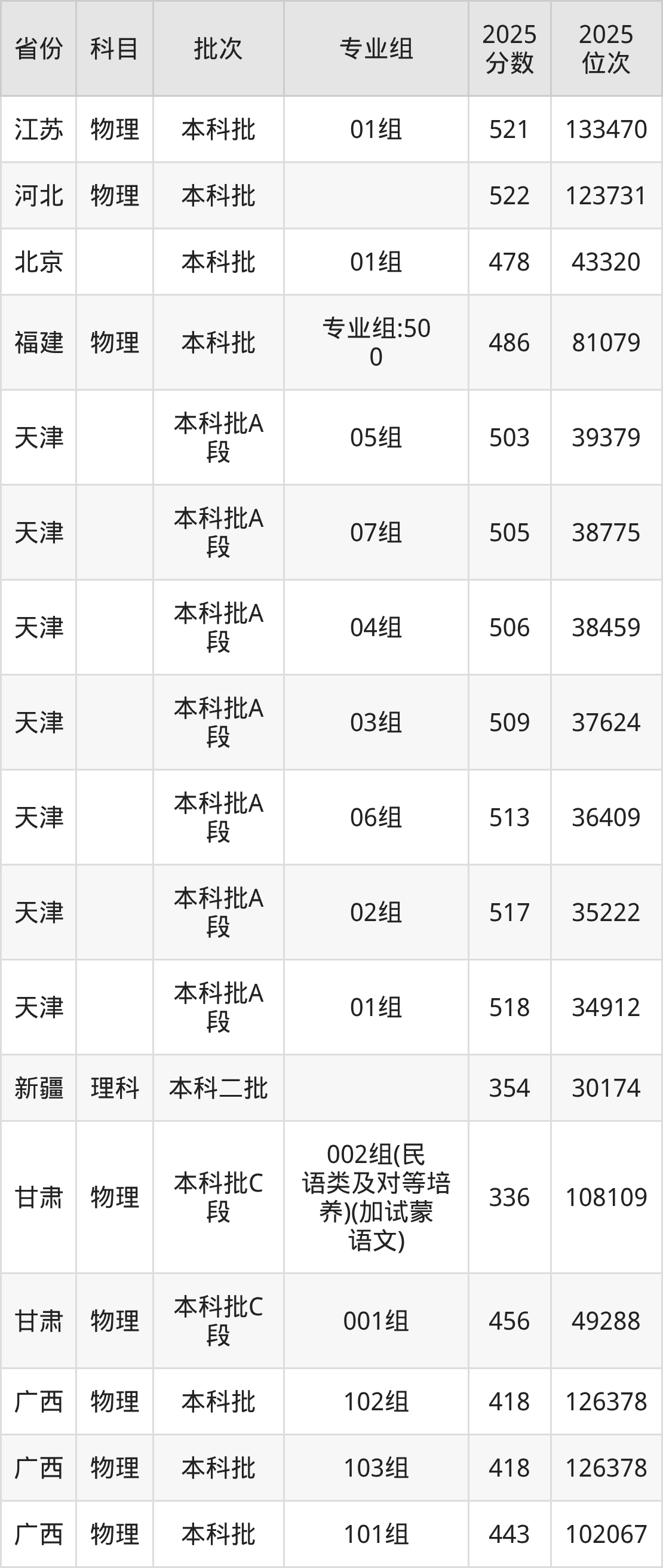 2025年在本科物理类进行招生,各专业组分数线详情如下: