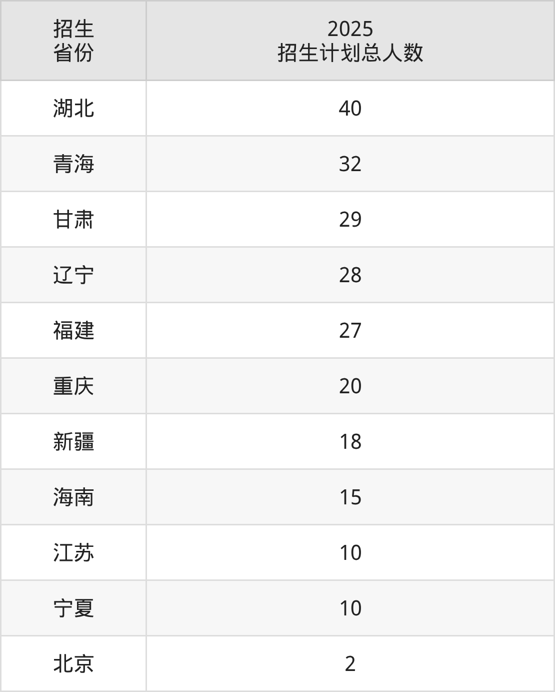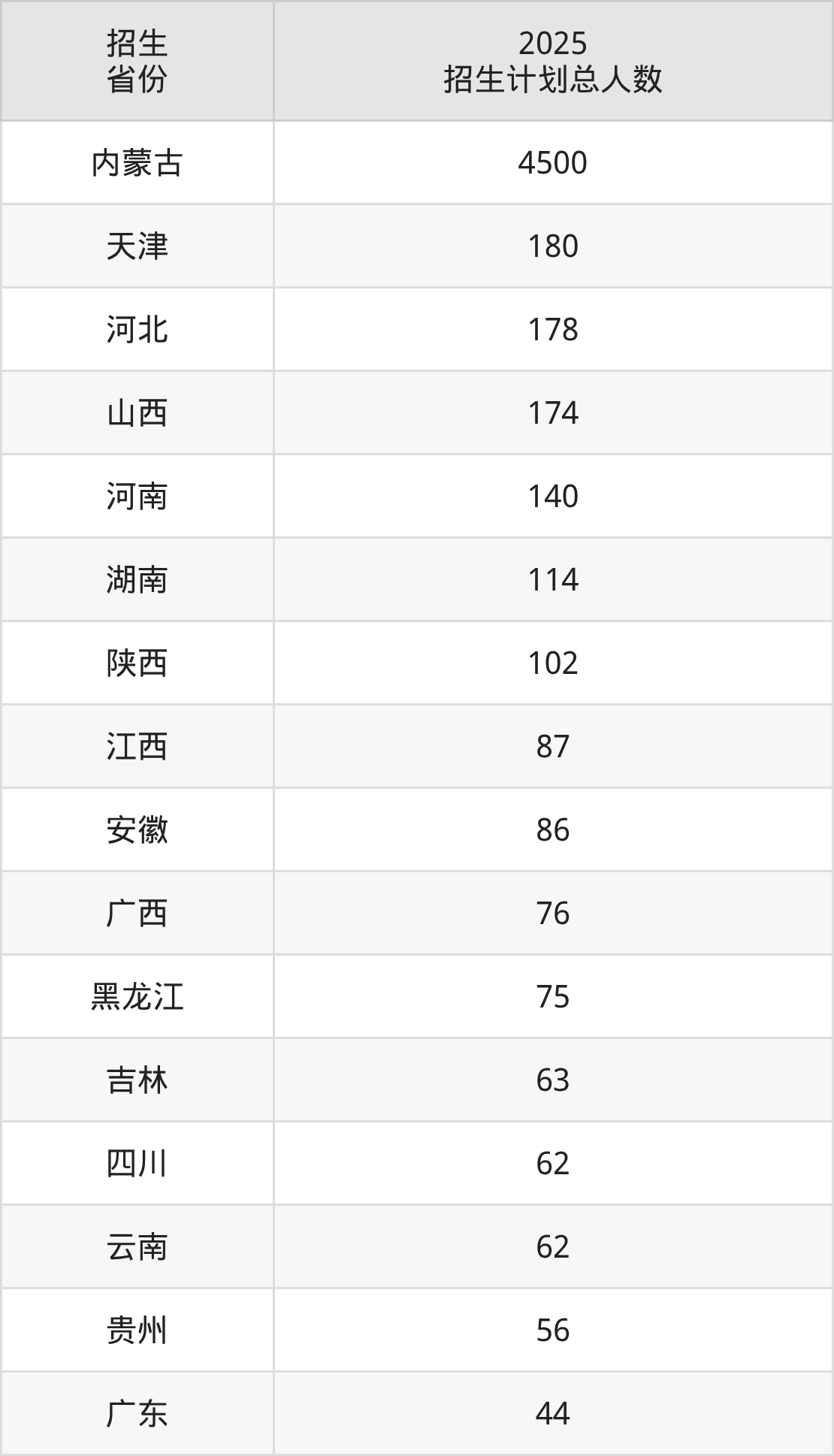 2025年内蒙古农业大学面向全国27个省市开展本科招生;招生专业共75个,招生人数共5820人。2025年在内蒙古自治区招生计划总人数是4500人,其中,内蒙古农业大学在内蒙古自治区招生人数最多的是软件工程。内蒙古农业大学在各省具体招生人数情况如下表。