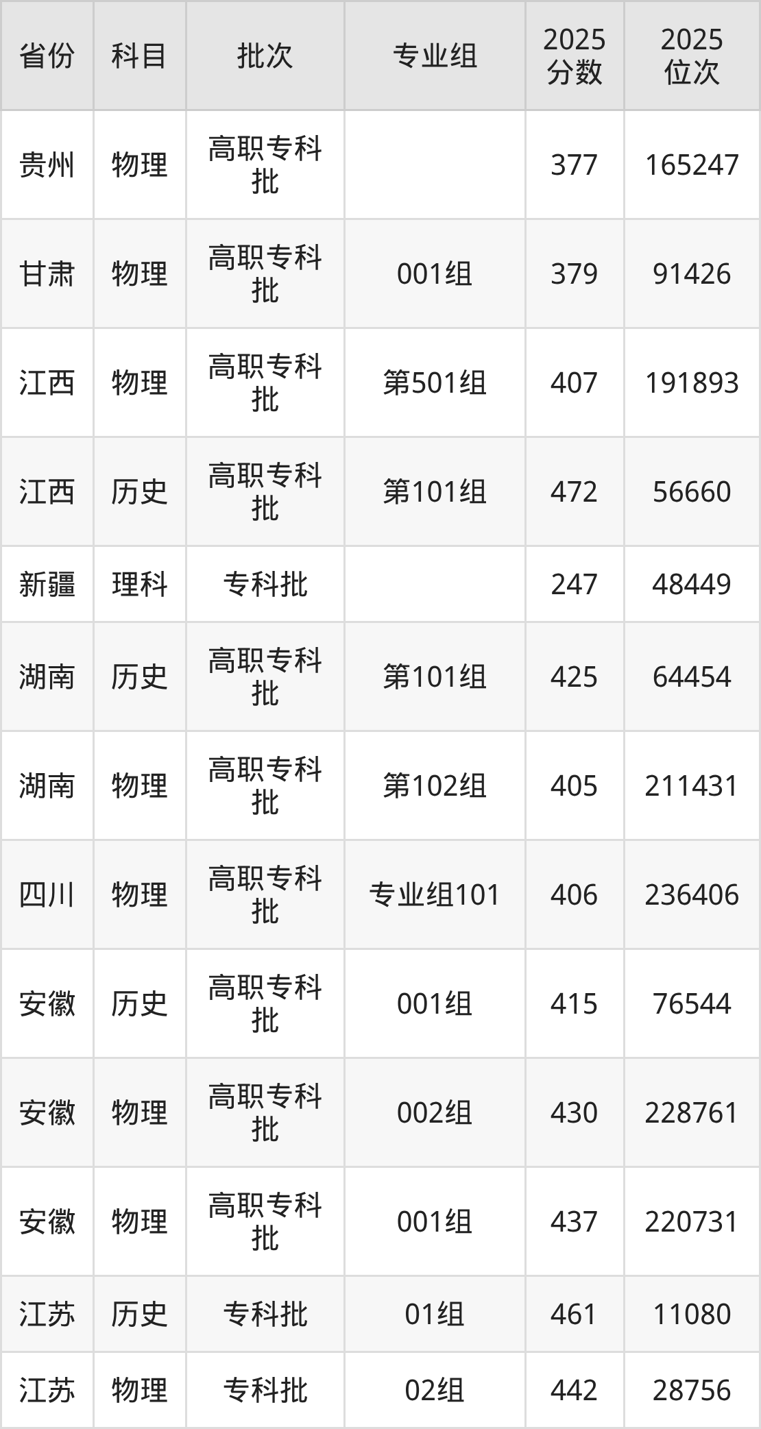 2025年在专科物理类进行招生,各专业组分数线详情如下: