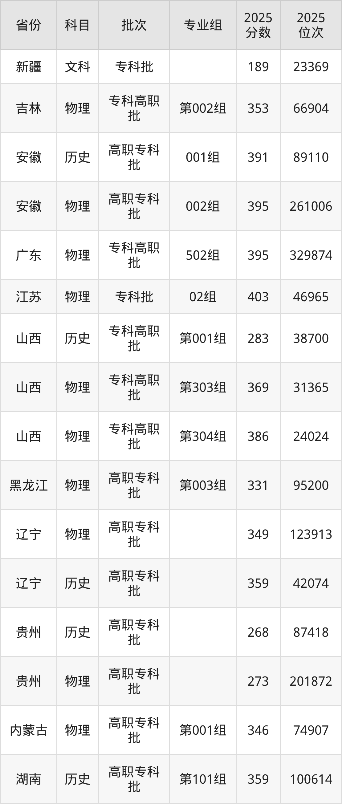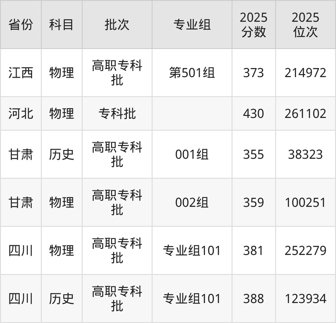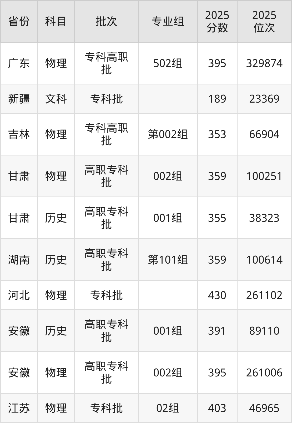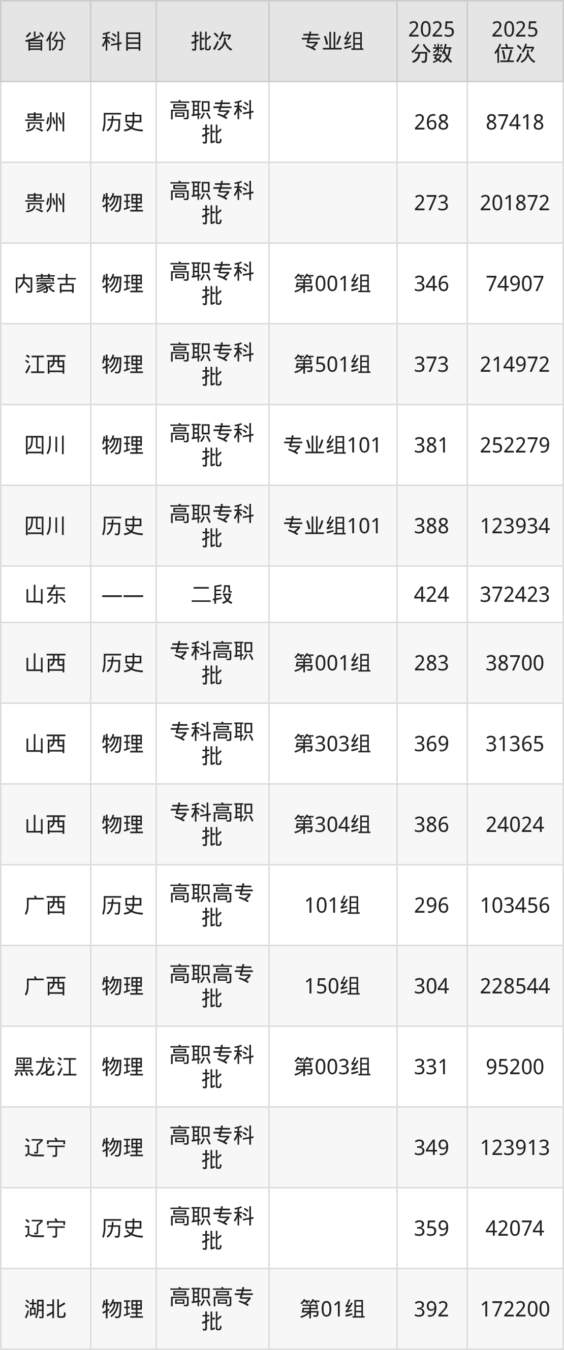 2025年在专科物理类进行招生,各专业组分数线详情如下: