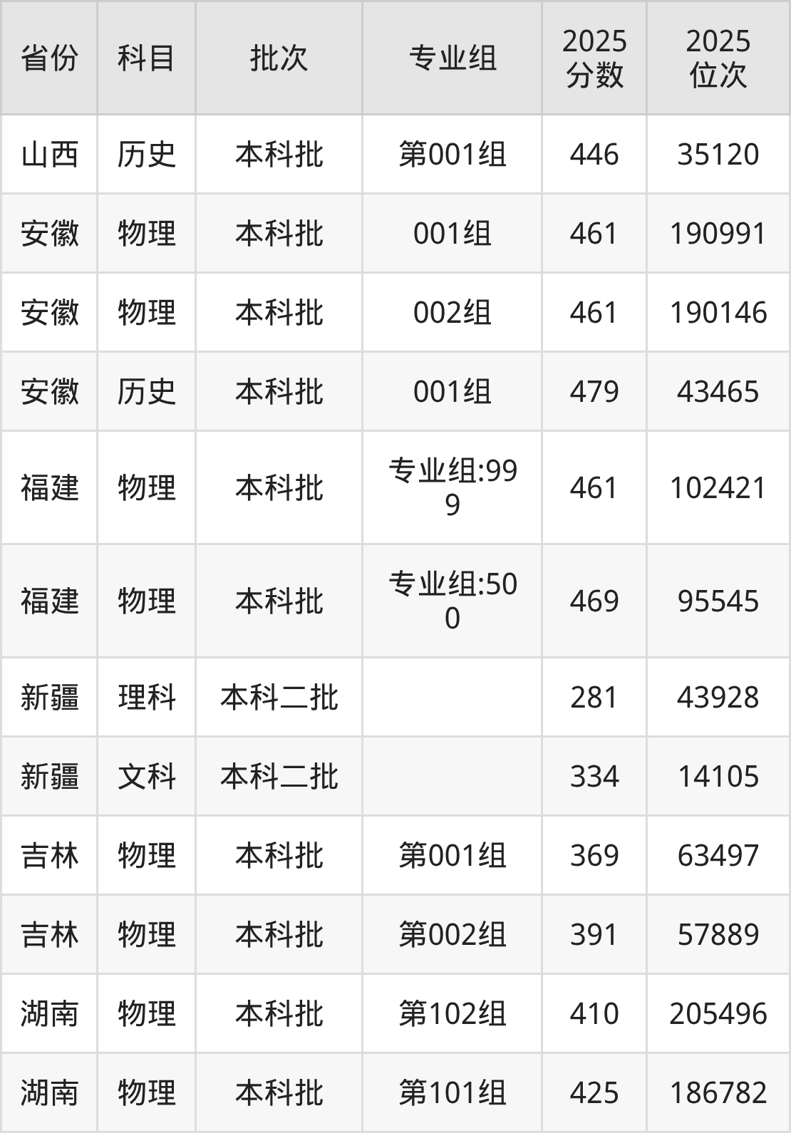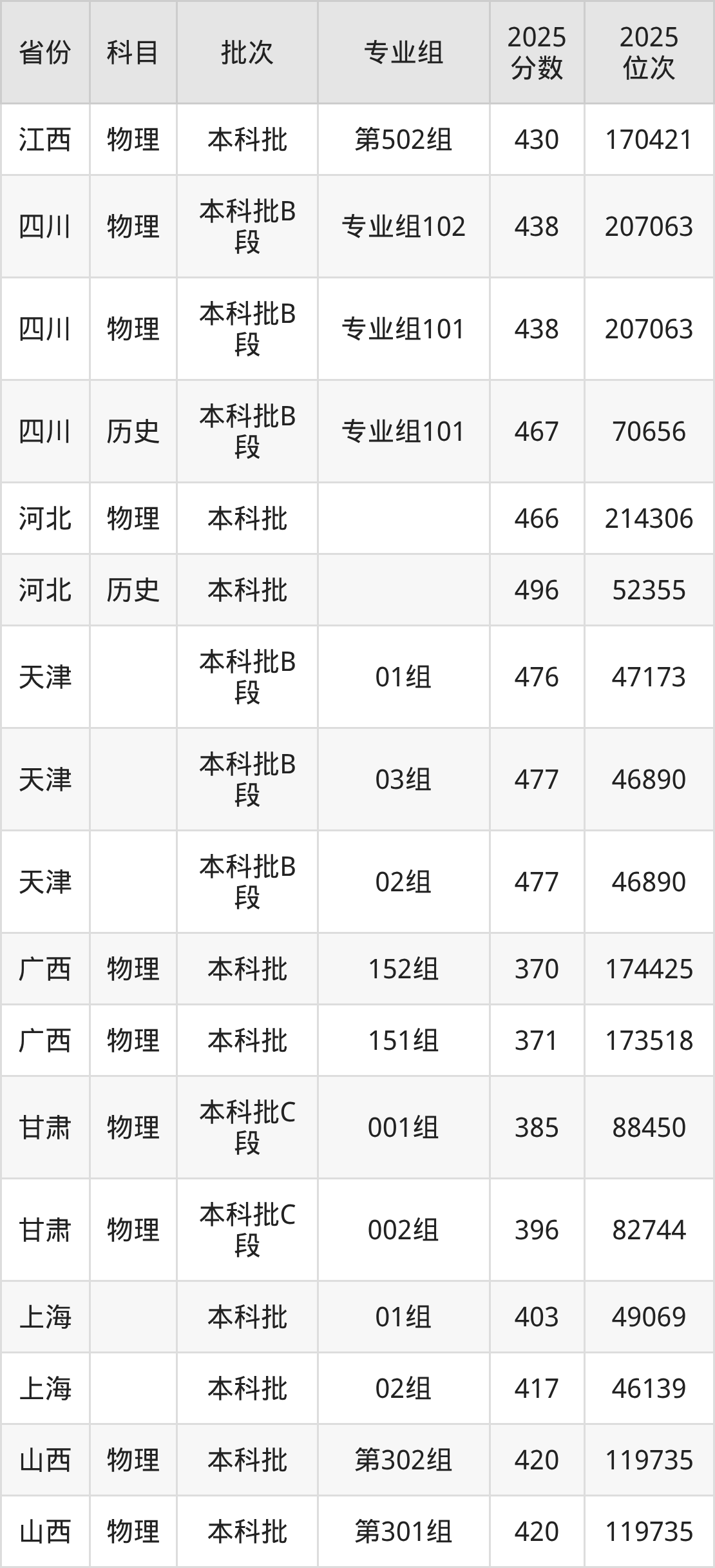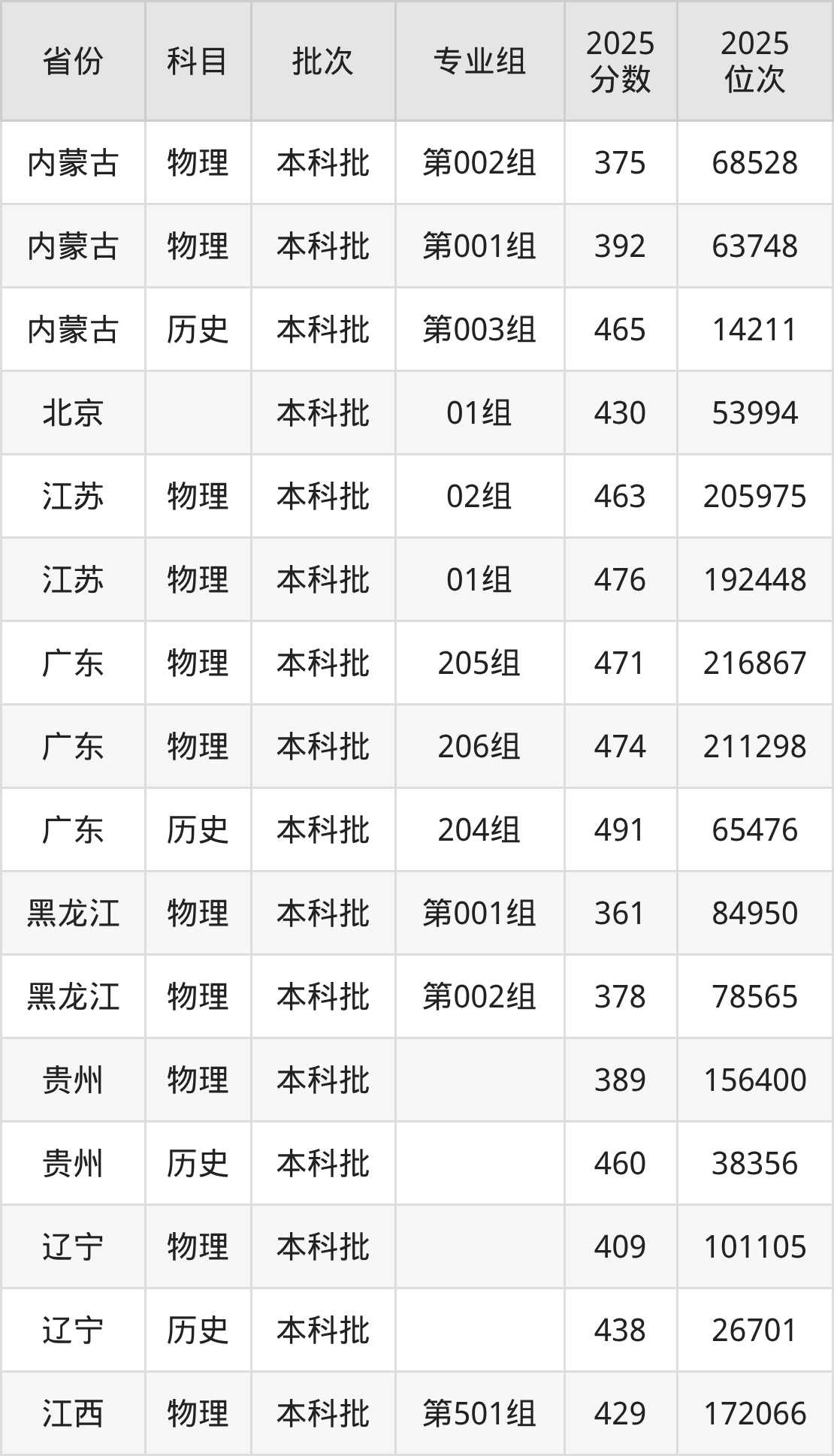 2025年在本科物理类进行招生,各专业组分数线详情如下: